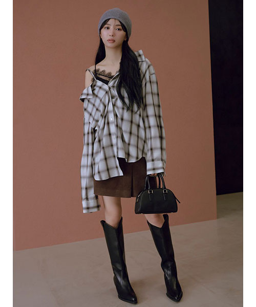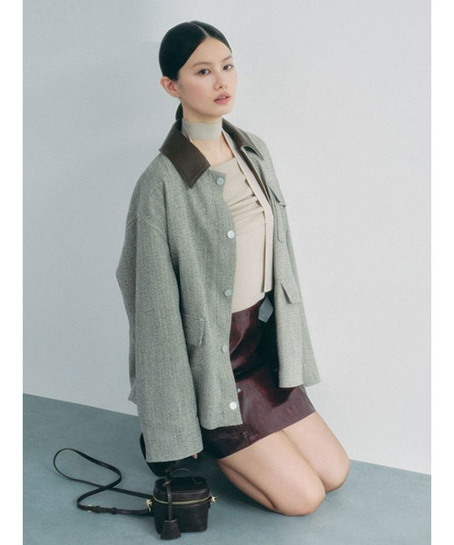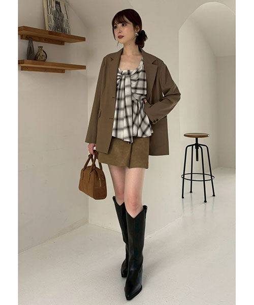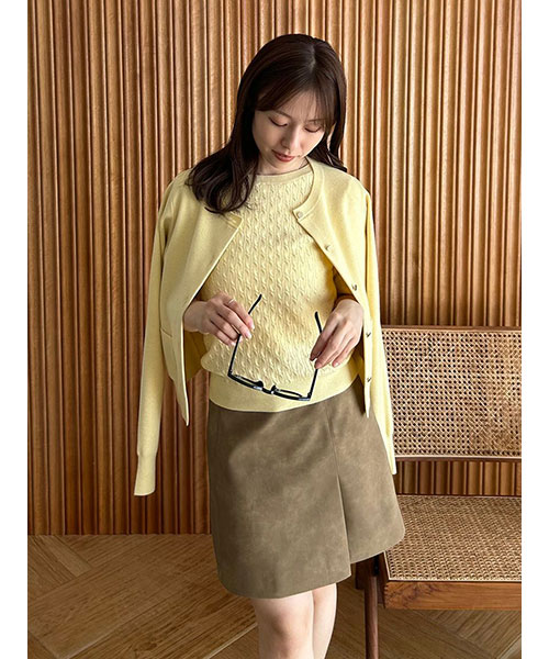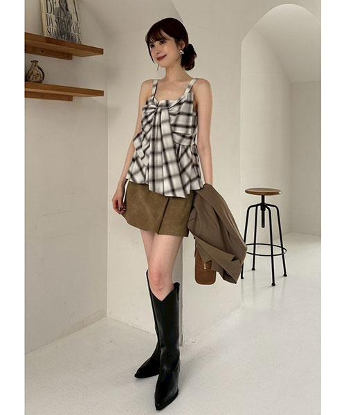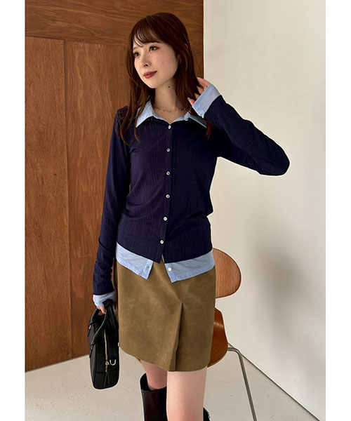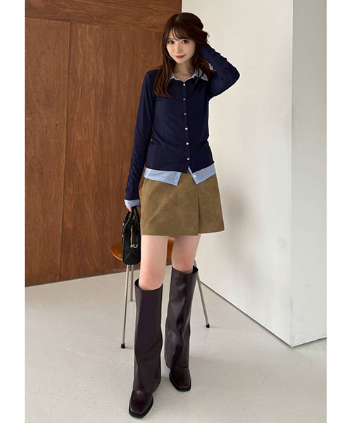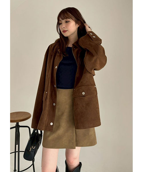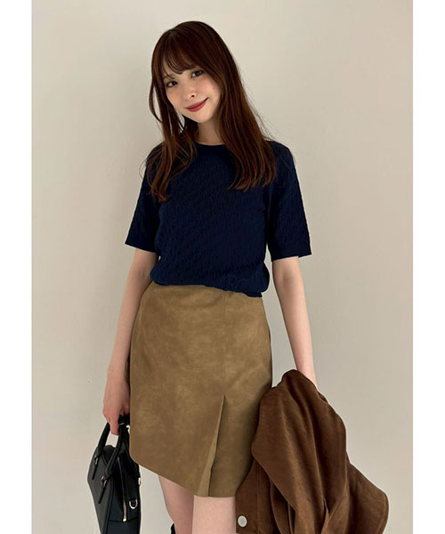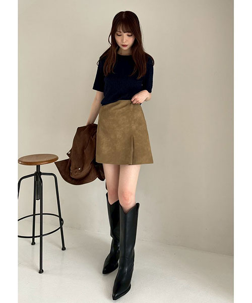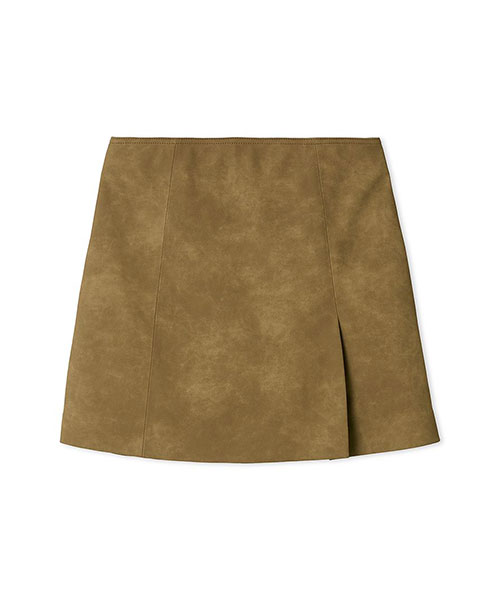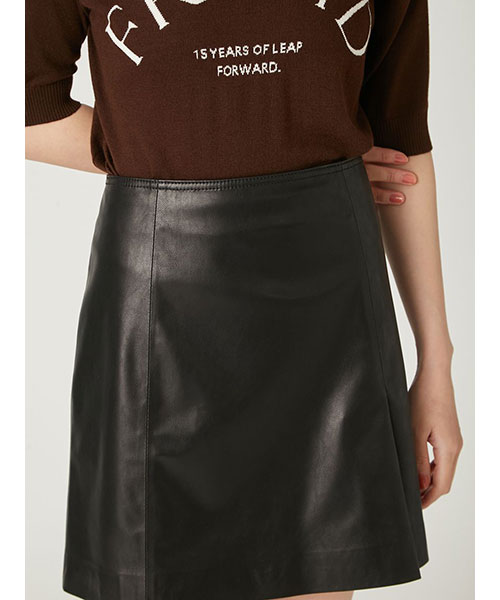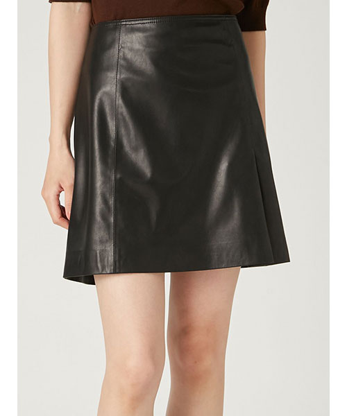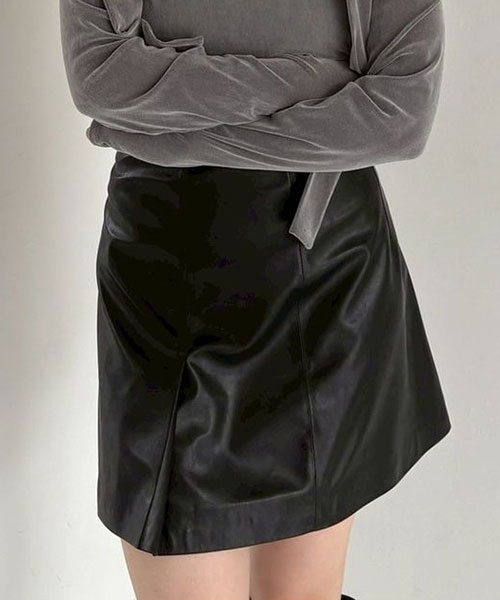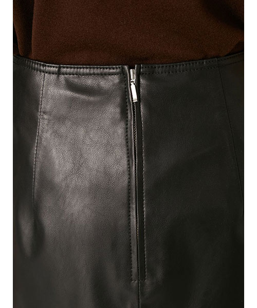 コンパクトなミニ丈で、脚長効果も期待できるシルエット。またしっかりとしたレザー系の素材感で、裏地もついているので安心感もあります。
