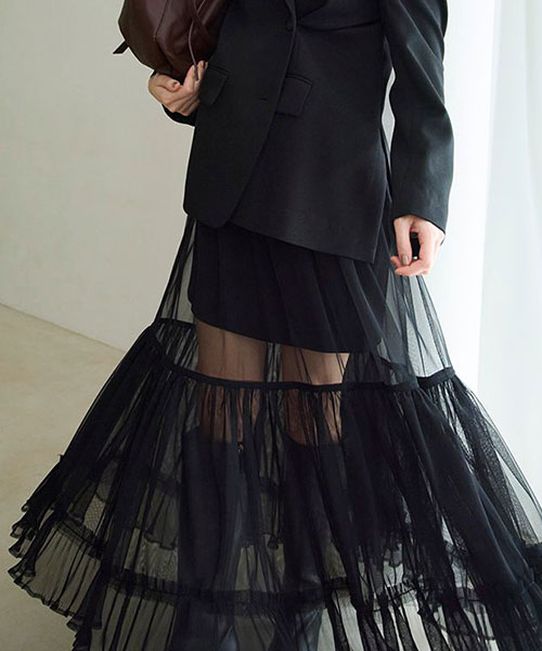 マキシ丈のチュールスカートは、繊細な透け感がセンシュアル。