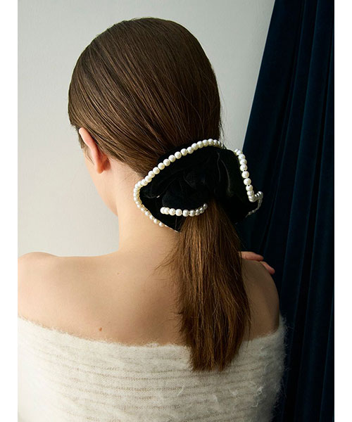 ヘムラインに沿ってパールビジューをぐるりと贅沢にあしらったスペシャルなシュシュ。