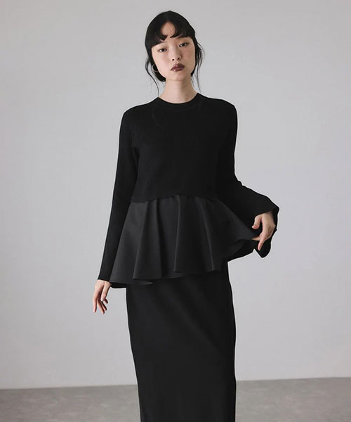 コンパクトなニットのウエストから広がる異素材のペプラムシルエットが魅力的なワンピース。