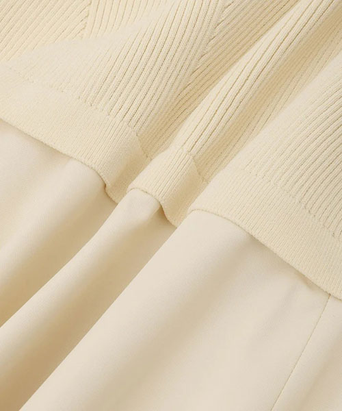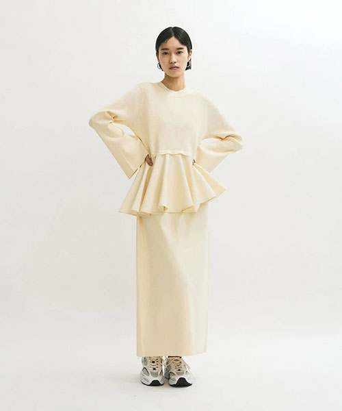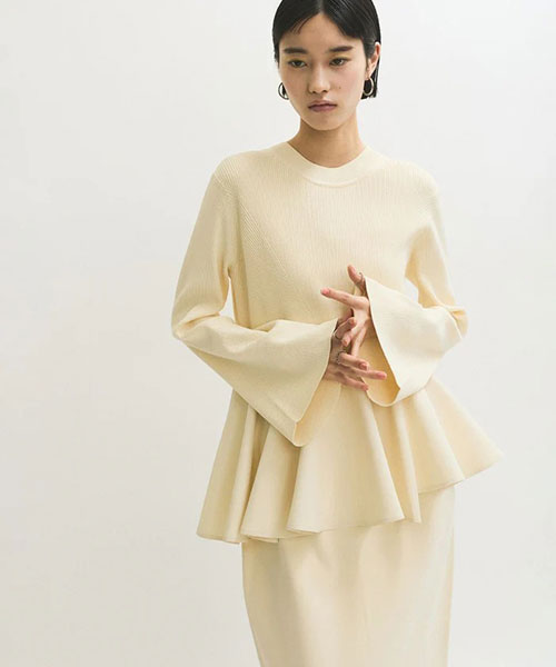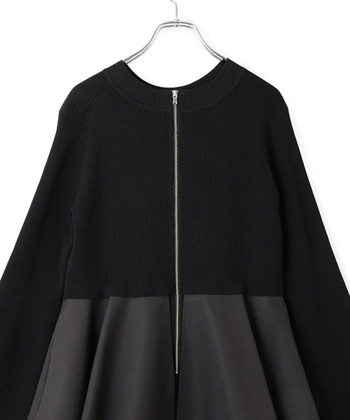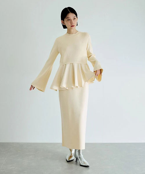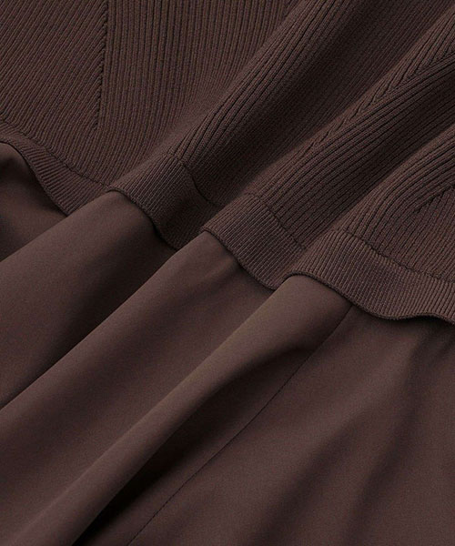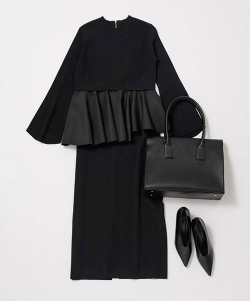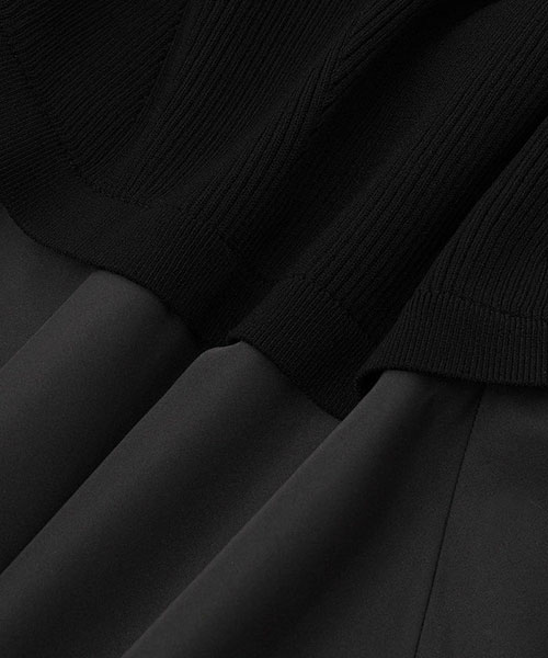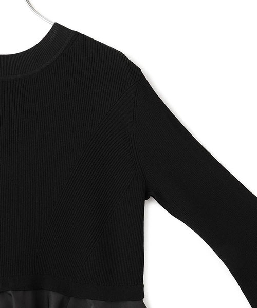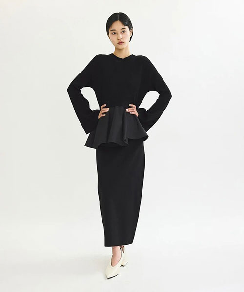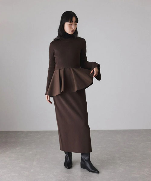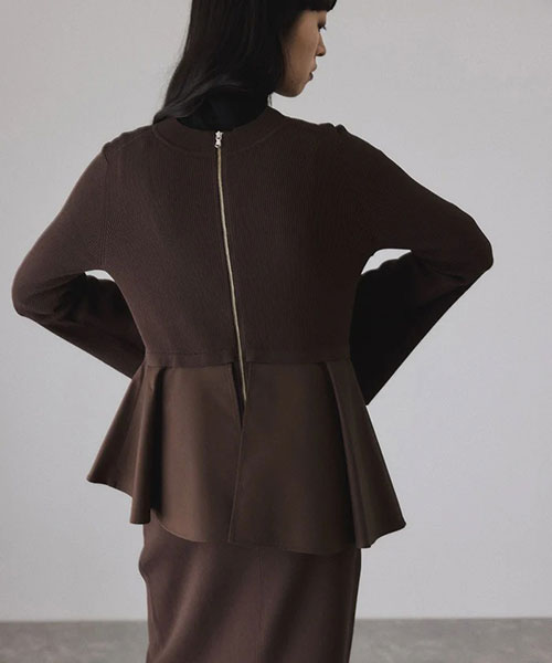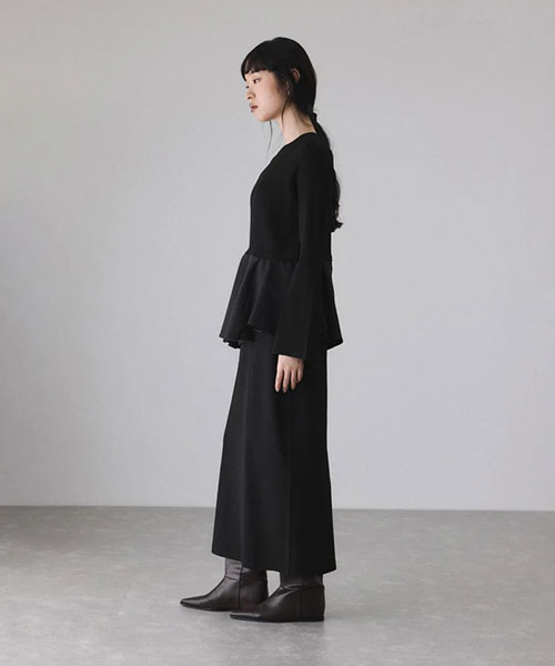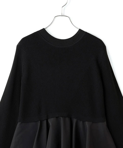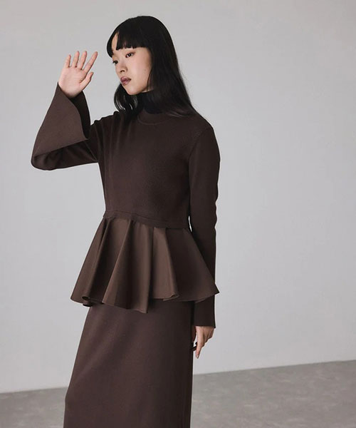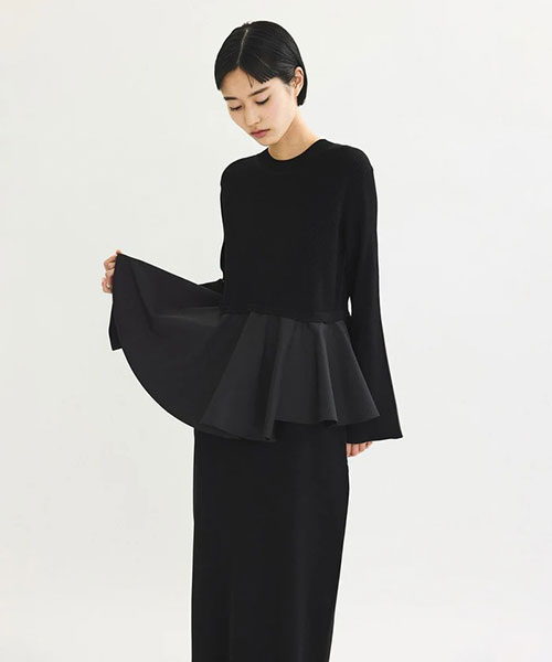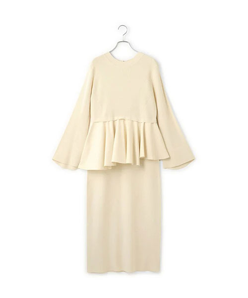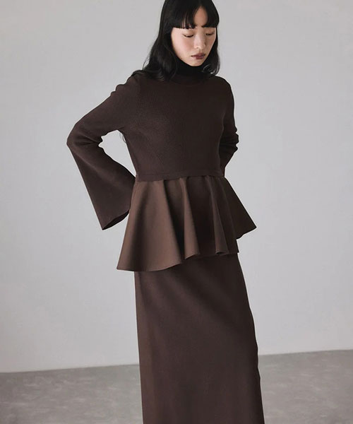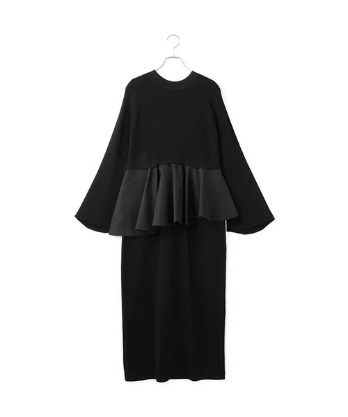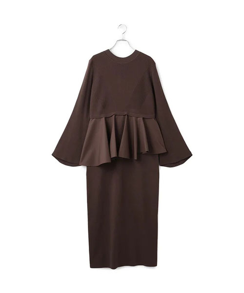 コンパクトなニットのウエストから広がる異素材のペプラムシルエットが魅力的なワンピース。