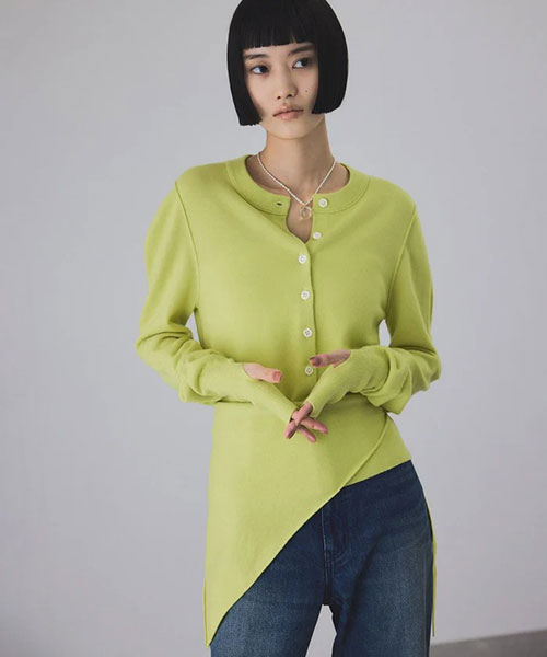 カーディガンは縫い代を表にした抜け感のあるコンパクトサイズ。