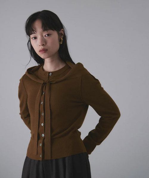 カーディガンは縫い代を表にした抜け感のあるコンパクトサイズ。