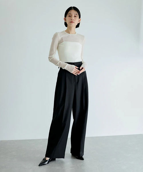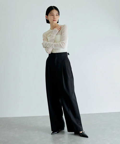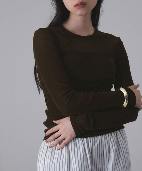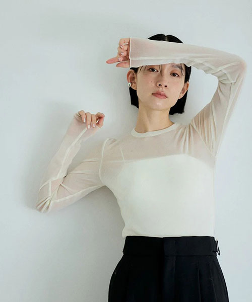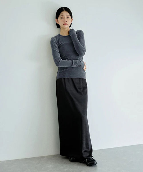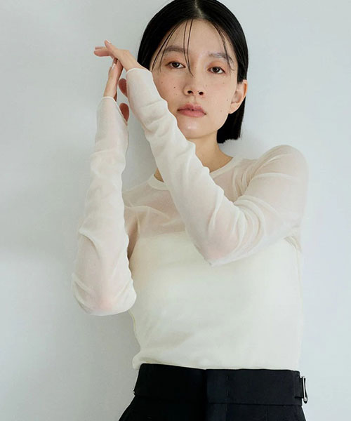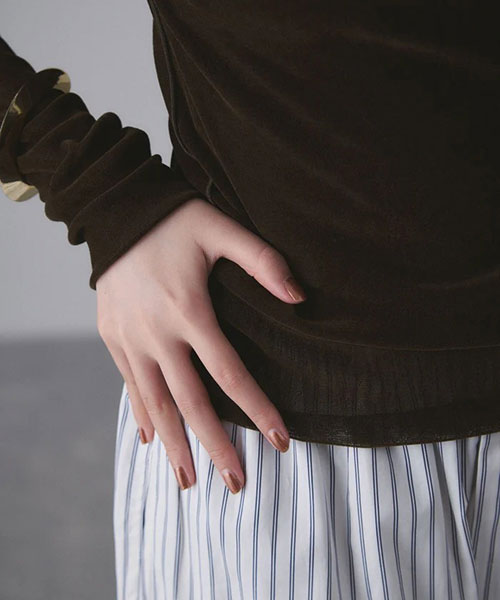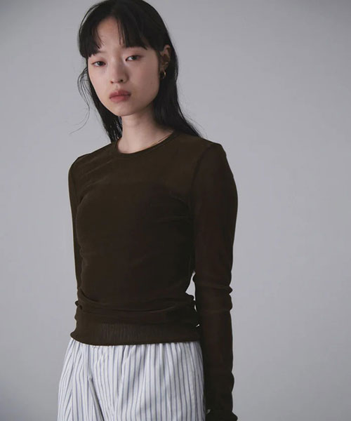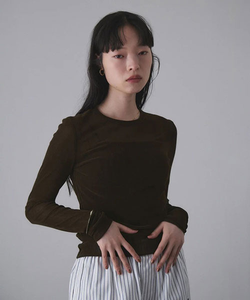 ベロアのようなマットな表面感でありながら、チュールのニュアンスのある透け感が女性らしい雰囲気をプラスしてくれるプルオーバー。