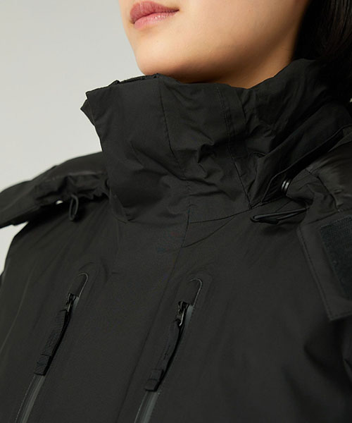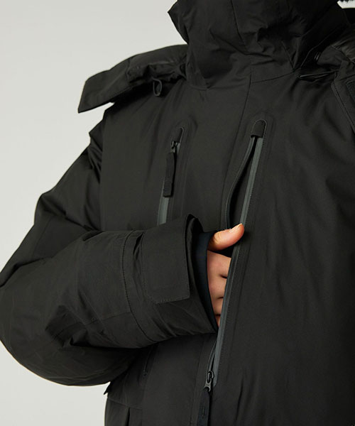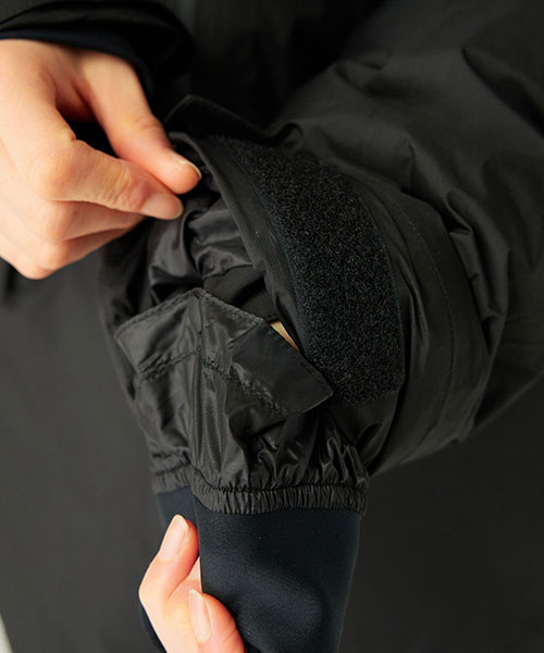 表地の縫い目にはフルシーム加工を施し、雨天でも安心の防水性を確保。さらに、止水ファスナーや調整可能なフード、取り外し式インナーカフス、裾のアジャスターなど、快適性を高めるディテールを随所に搭載しています。