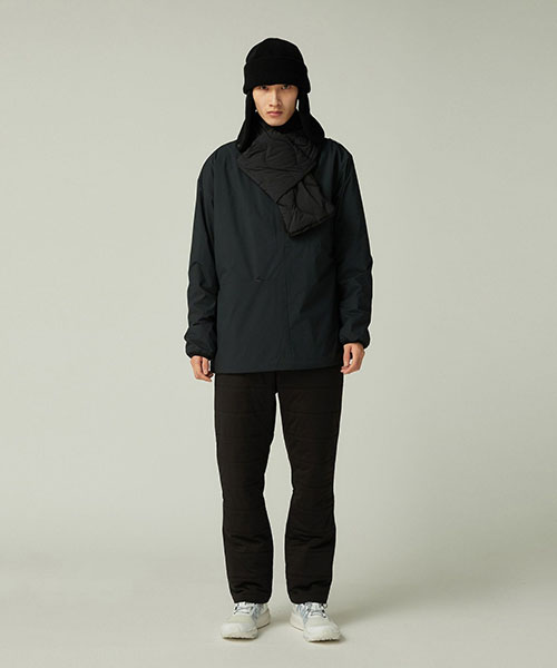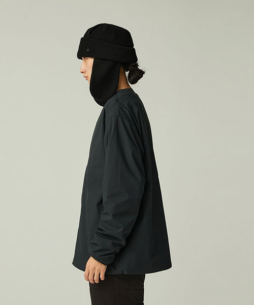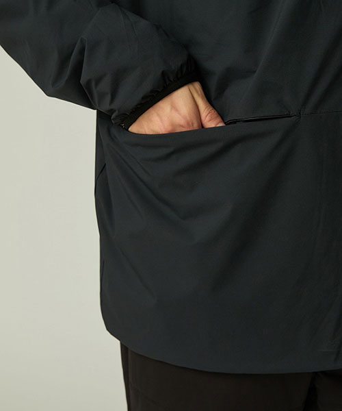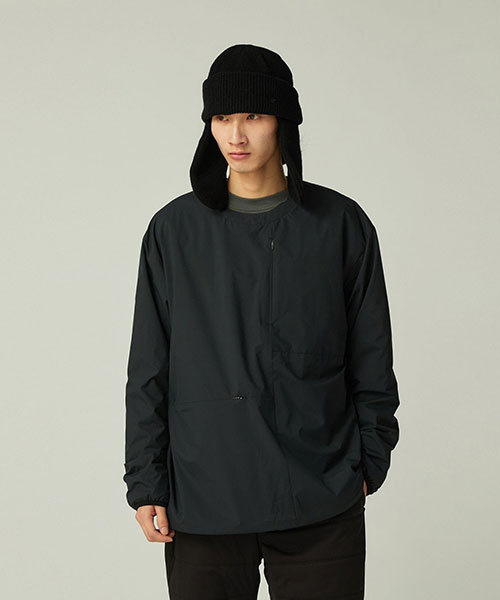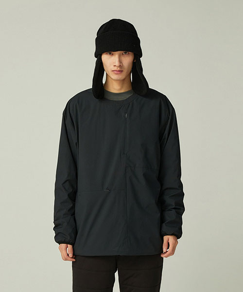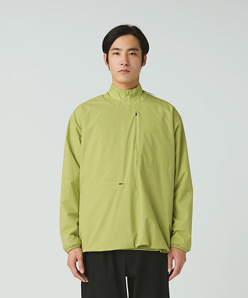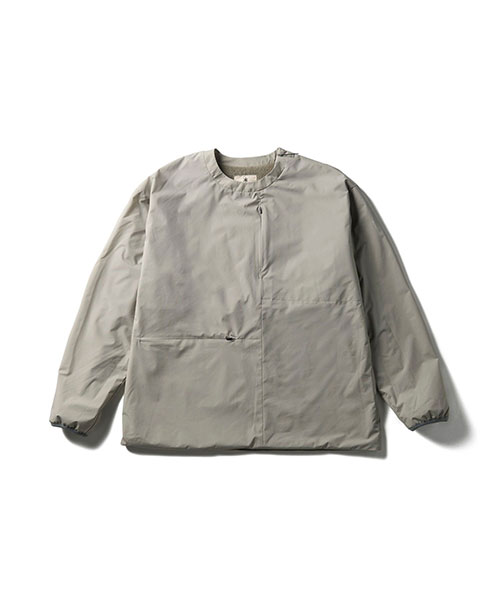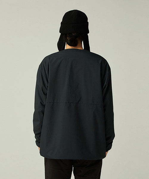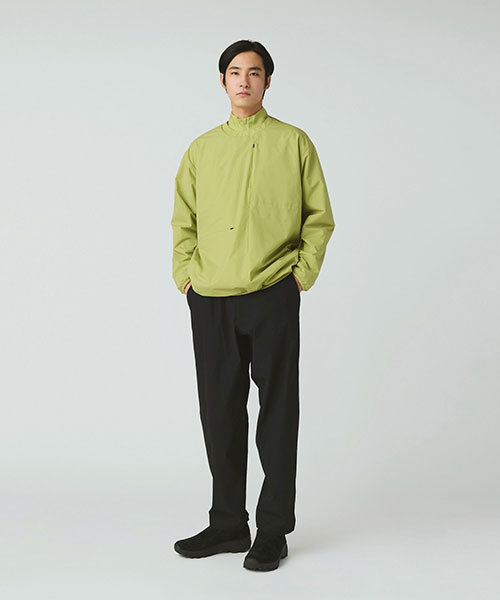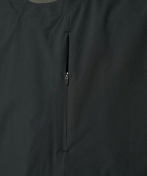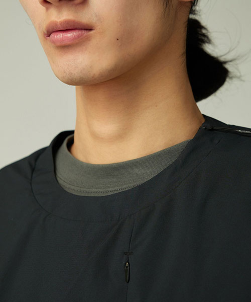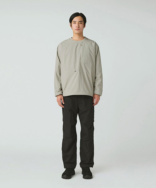 Tシャツ以上、アウター未満の存在を担う、ノマドプルオーバーです。ベーシックな、長袖のクルーネックデザイン。機能性に加えて、より良い着用感を目指しました。ほどよくゆとりを持たせた新しいシルエットをベースに、ファスナー付きポケットを前身頃にアシンメトリーに配置しています。秋口はTシャツ等の上に重ねるアウターとして、冬にはジャケット、コート類のインナーとして、着方のバリエーションを季節を跨いで楽しめるアイテムです。同シリーズのパンツとセットで取り入れるのもおすすめ。
