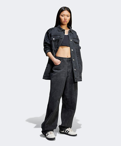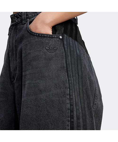 ウエストからフロントの裾まで伸びるスリーストライプス入り。