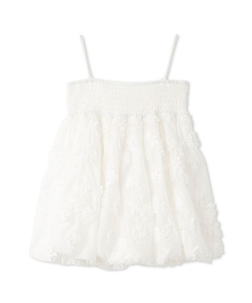 ナチュラルなシボ感のあるシアー素材に、立体的な花モチーフを咲かせたクラフト感のある素材を使用。軽やかで奥行きのある表情が特徴で、纏うだけで華やかさをプラスします。