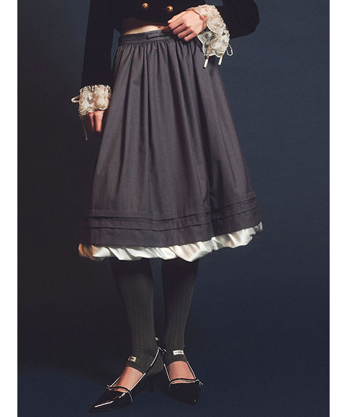 裾にバイカラーのサテン生地を使用し、軽やかなバルーンシルエットに仕上げたミディアム丈のギャザースカート。ウエストにはリボンディテールを施し、フェミニンなムードを引き立てます。裏地の裾には張りのあるチュールを忍ばせており、立体的なフォルムをキープ。歩くたびに優しく揺れる、存在感のあるデザインです。
