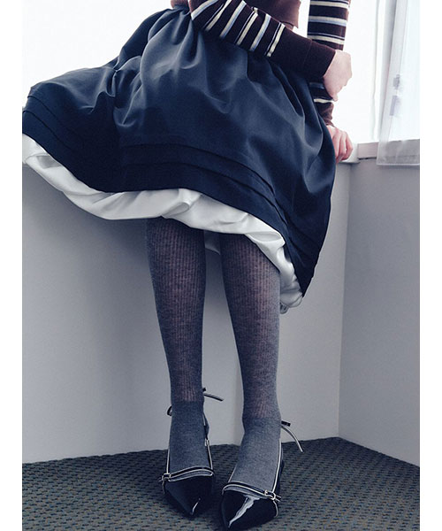 裾にバイカラーのサテン生地を使用し、軽やかなバルーンシルエットに仕上げたミディアム丈のギャザースカート。ウエストにはリボンディテールを施し、フェミニンなムードを引き立てます。裏地の裾には張りのあるチュールを忍ばせており、立体的なフォルムをキープ。歩くたびに優しく揺れる、存在感のあるデザインです。