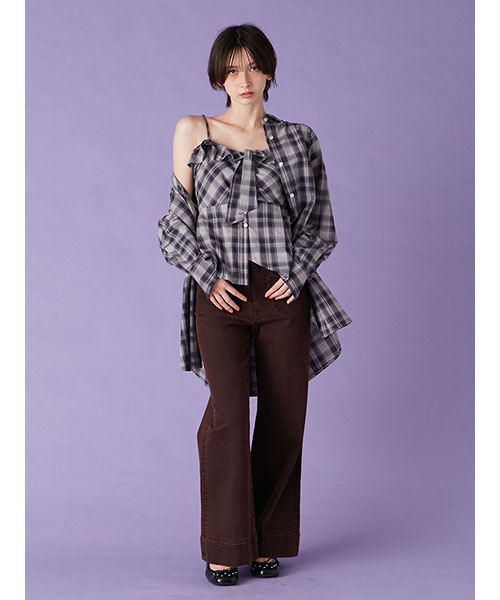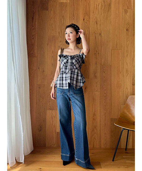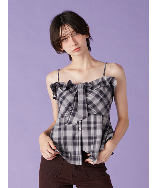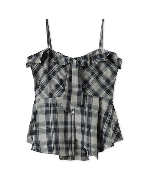 ボウタイシャツをウエストに巻いたようなデザインが目を惹く、ユニークなペプラムビスチェ。シンプルなニットトップスやカットソーに重ねるだけで、鮮度あるレイヤードスタイルが完成します。立体的なシルエットでウエストをマークし、メリハリのある着こなしに。オンブレー調のチェック柄がどこかナードなムードを演出し、着る人の個性を引き立てます。