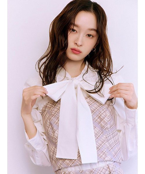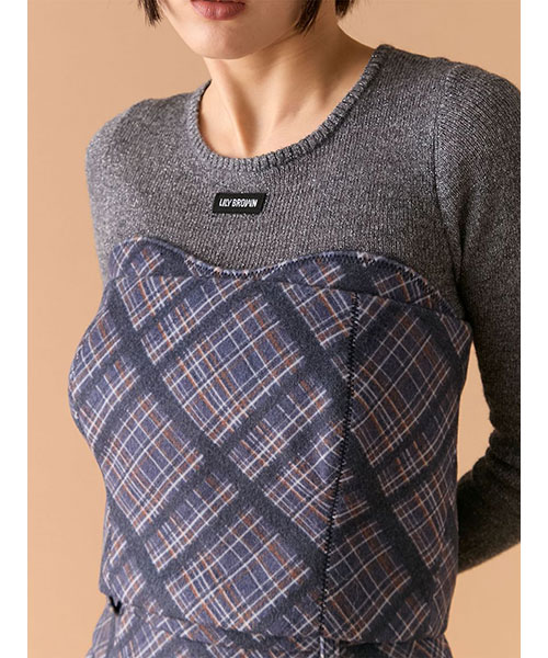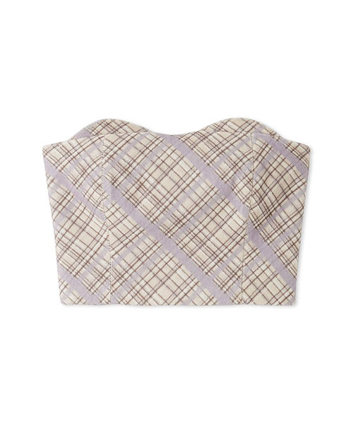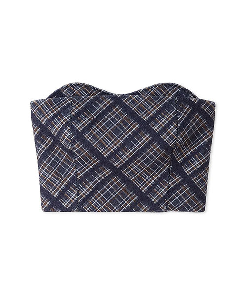 コンパクトながらも存在感のある、オリジナルチェック柄のビスチェ。胸元はレイヤード風に仕立て、ジグザグステッチがアクセントに。ストレッチ素材の特性を活かし、身体にすっきりフィットするようパターンにもこだわりました。単品使いはもちろん、同シリーズのスカート(品番LWFS255130)とのセットアップでの着用もおすすめです。