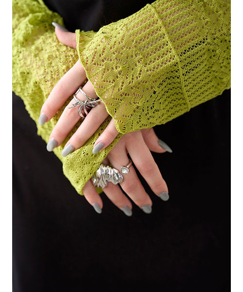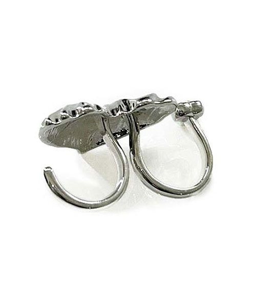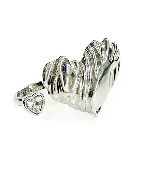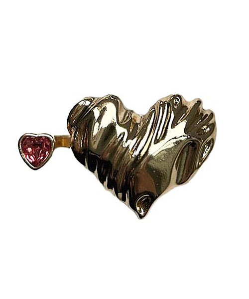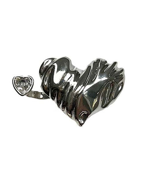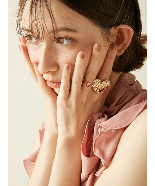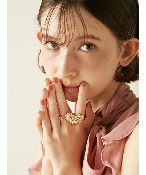 2連風に見えるダブルリングタイプのユニークなデザイン。ヴィンテージ感漂う大ぶりなメタルハートパーツと、きらりと輝くガラスのハートストーンをあしらい、指先に華やぎをプラス。シンプルな装いのアクセントにも、甘めなスタイリングの仕上げにも活躍する存在感のあるアイテムです。