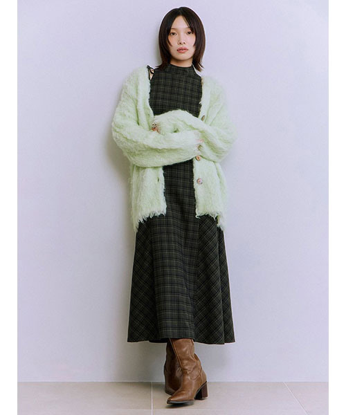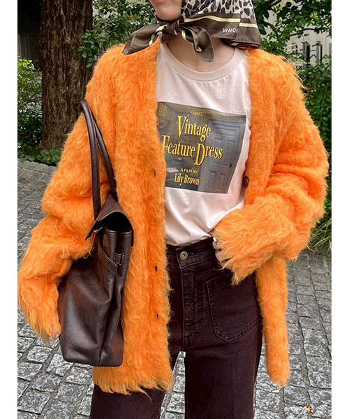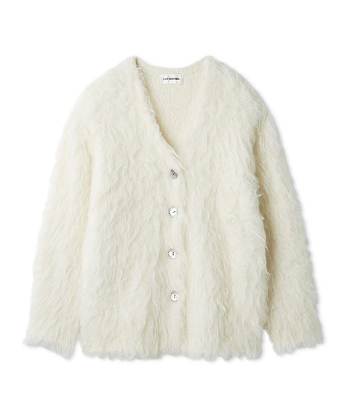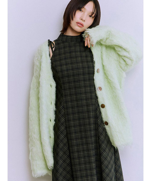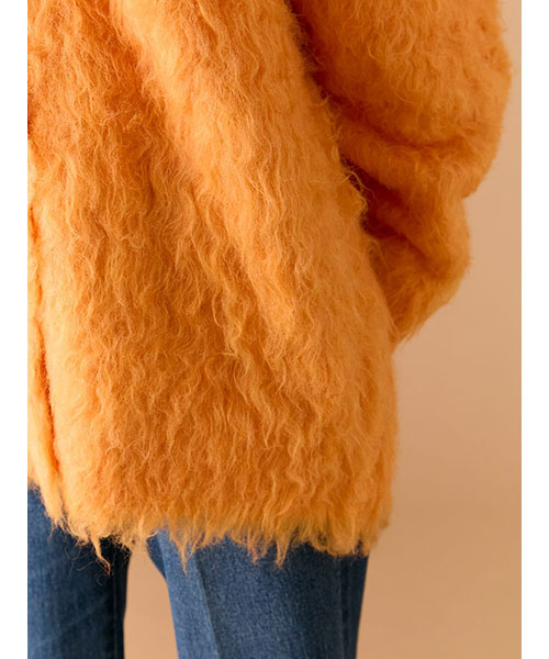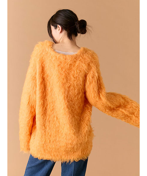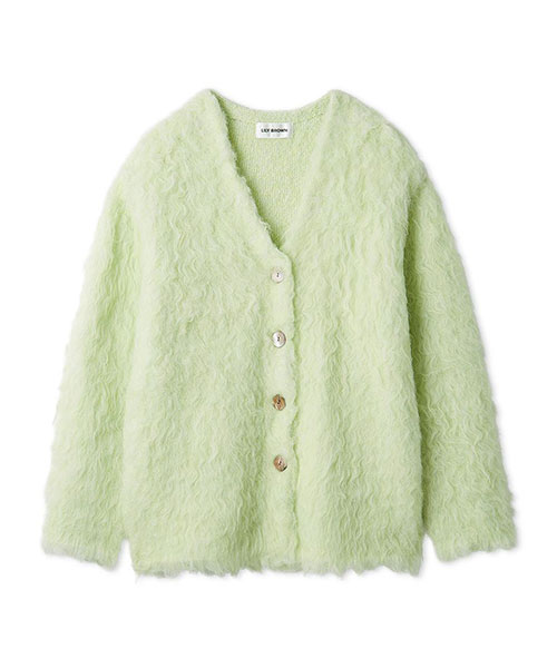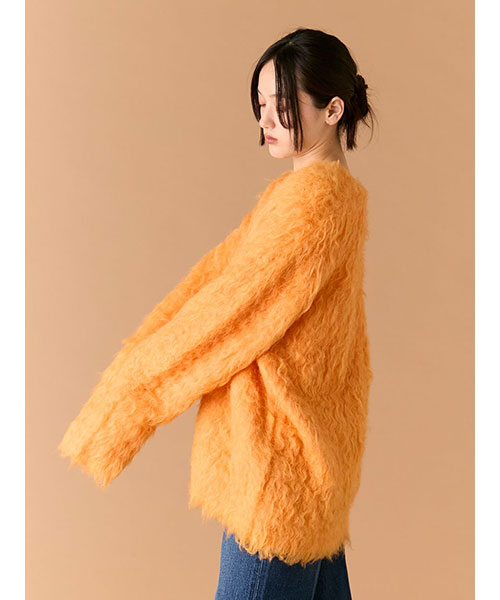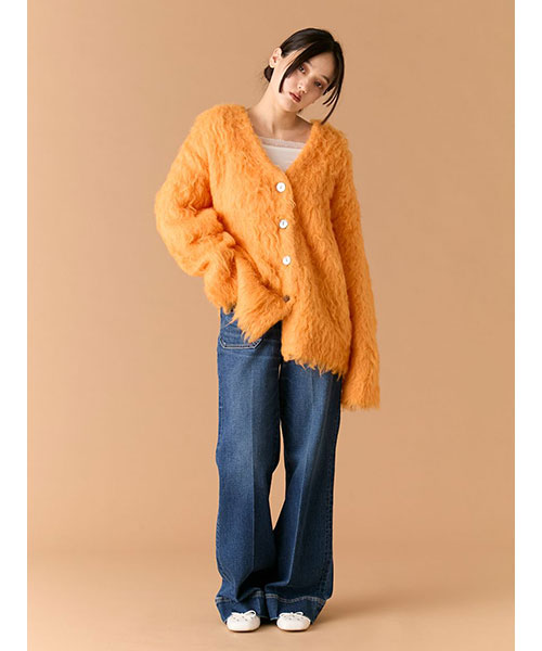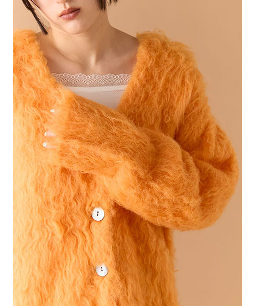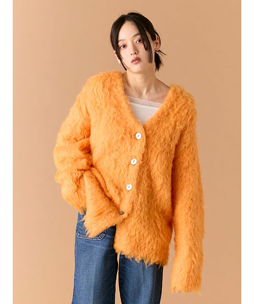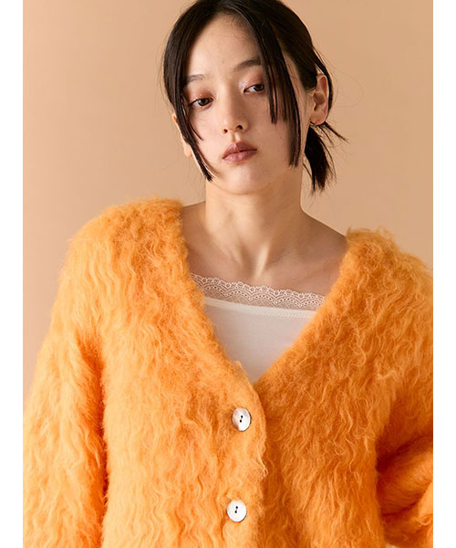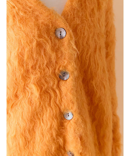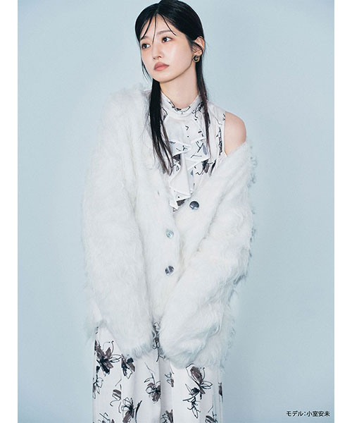 柔らかい毛足を掻いてふんわりと仕上げた、優しい表情のフェザーカーディガン。ボリューム感のあるシルエットながら、深めに開いたVネックがデコルテまわりをすっきりと見せてくれます。ヒップが隠れるオーバーサイズ設計で、気になる部分を自然にカバー。フロントには光沢感のある大きめの貝ボタンをあしらい、上品なアクセントを添えました。サテンキャミワンピースとのレイヤードでフェミニンに、デニムやカジュアルアイテムと合わせればこなれ感のある大人スタイルにもマッチする、着回し力の高い一着です。