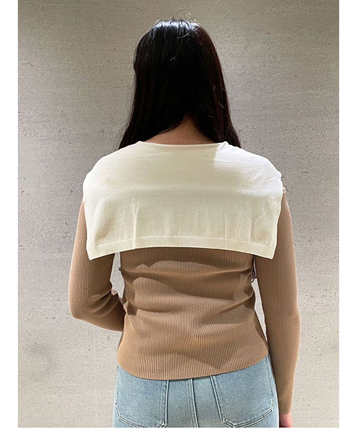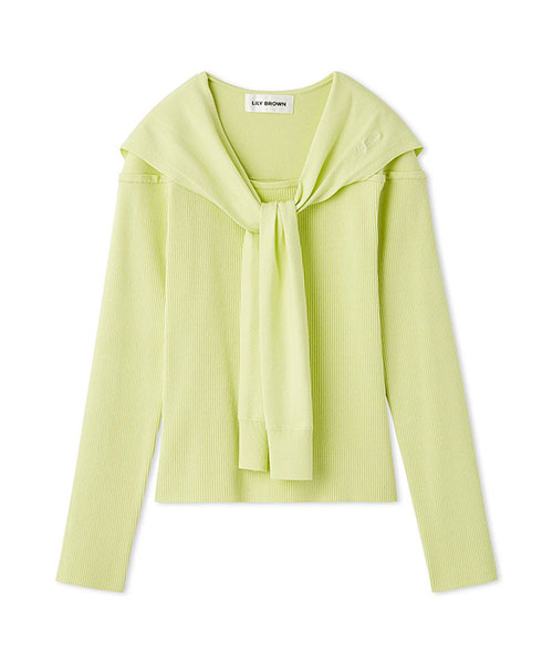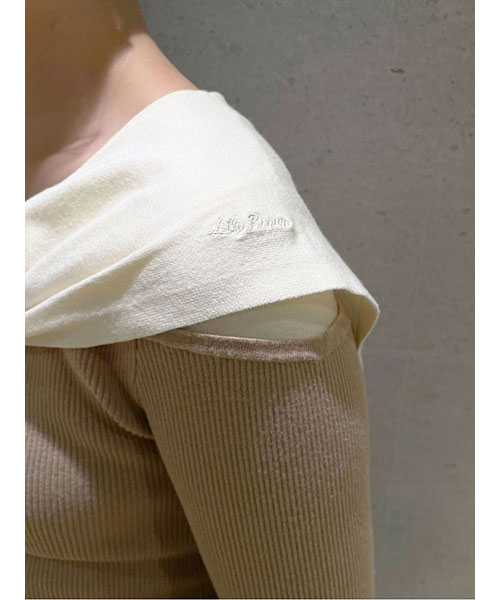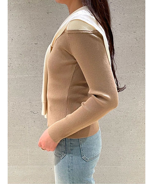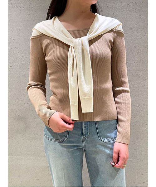 セーラーカラーとオフショルダーを組み合わせた、レイヤード風デザインのニットトップス。肩掛け風のセーラーカラーがトラッドな雰囲気を演出しつつ、リボンを緩めに結べば抜け感が生まれ、デコルテを美しく魅せてくれます。襟元にはさりげない刺繍をあしらい、ディテールにもこだわりをプラス。1枚でトレンド感ある着こなしが完成します。