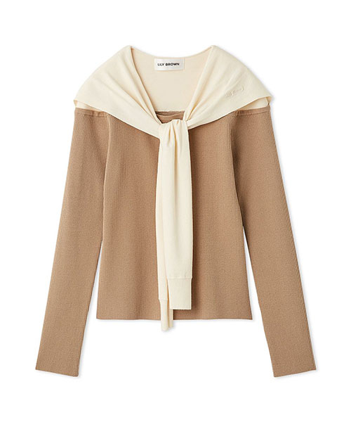 セーラーカラーとオフショルダーを組み合わせた、レイヤード風デザインのニットトップス。肩掛け風のセーラーカラーがトラッドな雰囲気を演出しつつ、リボンを緩めに結べば抜け感が生まれ、デコルテを美しく魅せてくれます。襟元にはさりげない刺繍をあしらい、ディテールにもこだわりをプラス。1枚でトレンド感ある着こなしが完成します。