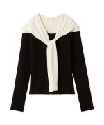 セーラーカラーとオフショルダーを組み合わせた、レイヤード風デザインのニットトップス。肩掛け風のセーラーカラーがトラッドな雰囲気を演出しつつ、リボンを緩めに結べば抜け感が生まれ、デコルテを美しく魅せてくれます。襟元にはさりげない刺繍をあしらい、ディテールにもこだわりをプラス。1枚でトレンド感ある着こなしが完成します。