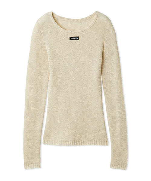 きらめくラメ糸と「LILY BROWN」のロゴニットネームテープがアクセントになった、シンプルながらも個性を放つニットトップス。すっきりとした細めの衿とリブ編みのボディが程よく身体にフィットし、美しいシルエットを演出。シアーな素材感で、インナーとのレイヤードを楽しめるアイテムに仕上げました。カジュアルにもフェミニンにも、幅広く着回せる1枚です。
