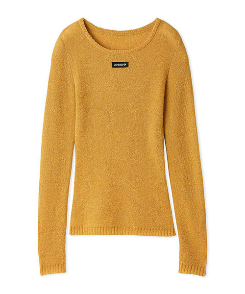 きらめくラメ糸と「LILY BROWN」のロゴニットネームテープがアクセントになった、シンプルながらも個性を放つニットトップス。すっきりとした細めの衿とリブ編みのボディが程よく身体にフィットし、美しいシルエットを演出。シアーな素材感で、インナーとのレイヤードを楽しめるアイテムに仕上げました。カジュアルにもフェミニンにも、幅広く着回せる1枚です。