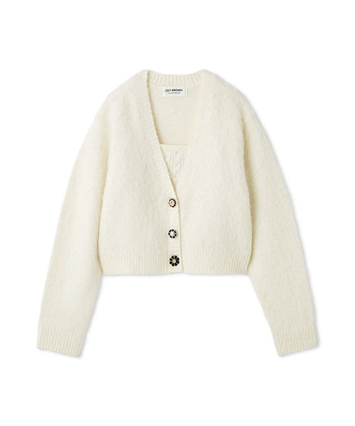 アルパカ混の温かみある糸で編み立てた、ビスチェとカーディガンのアンサンブルニット。ビスチェはケーブル編みにパールをあしらい、裾にフリルを施してフェミニンな甘さをプラスしました。カーディガンはベーシックな天竺編みで仕上げ、黒を基調とした高級感のあるビジューボタンを3つ配し、シンプルながらも華やぎのあるデザインに。セットでの着用はもちろん、それぞれ単品でもスタイリング可能で、着回し力に優れた万能アイテムです。