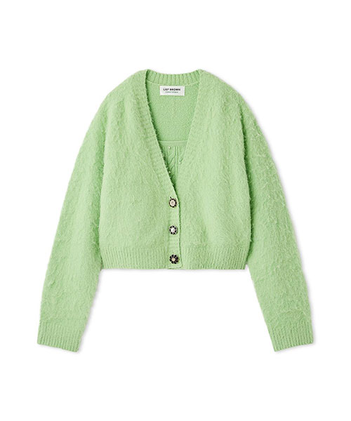 アルパカ混の温かみある糸で編み立てた、ビスチェとカーディガンのアンサンブルニット。ビスチェはケーブル編みにパールをあしらい、裾にフリルを施してフェミニンな甘さをプラスしました。カーディガンはベーシックな天竺編みで仕上げ、黒を基調とした高級感のあるビジューボタンを3つ配し、シンプルながらも華やぎのあるデザインに。セットでの着用はもちろん、それぞれ単品でもスタイリング可能で、着回し力に優れた万能アイテムです。