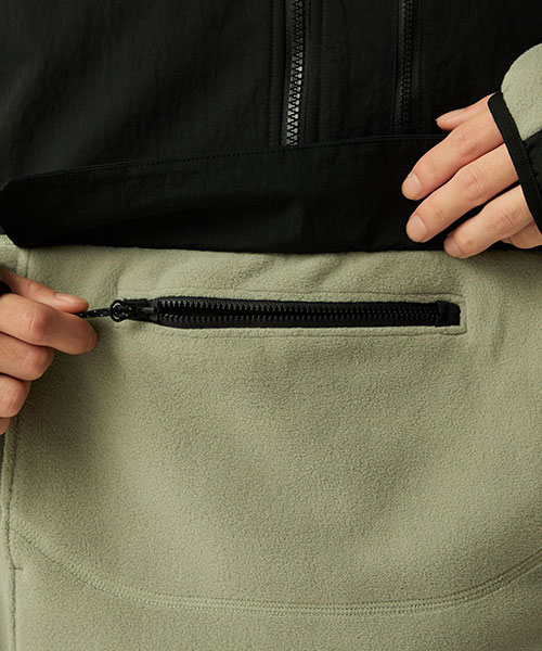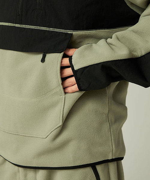 左胸と腹部には多用途ポケット、腹部両脇にはハンドウォームポケットを配置し、アウターとしても十分な収納力を備えています。ゆったりシルエットでライトアウターとしても快適に着用可能。