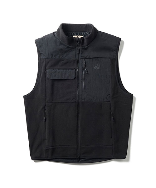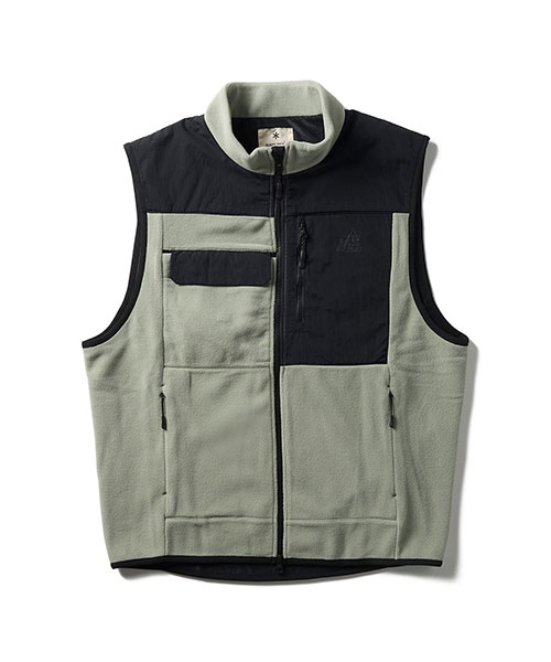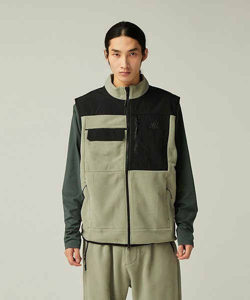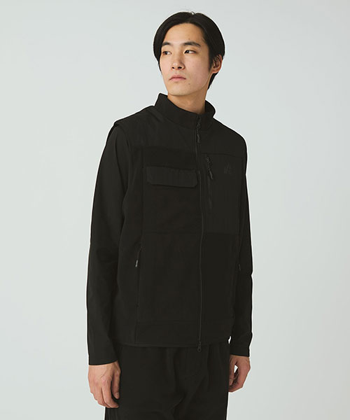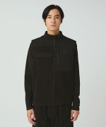 厚みのある両面起毛リサイクルフリースを使用し、裏地には保温性の高いメッシュ素材を全面に採用。肩周りには摩擦に強いタッサー素材を使用し、耐久性を確保しています。