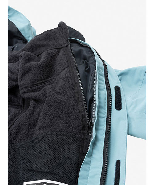 アウターシェルと専用ファスナーを連結して使える、ZIP IN ZIPシステム対応モデル。パックのショルダーハーネスが干渉する肩部分は、ナイロン生地で補強。肩部分の縫い目をなくして、当たりを軽減しています。