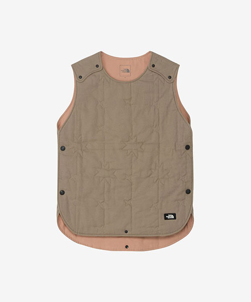表地と裏地にはやわらかなオーガニックコットンを採用。中わたには、サステナブルを考慮したカポック混素材を採用。両肩と脇は着脱がしやすいドットボタン仕様です。
