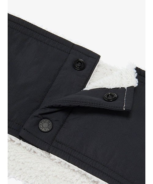 フリース面は毛足があり保温性に優れたシェルパフリース、布帛面は軽さと強度を兼ね備えた、防風性もあるリップストップナイロンを使用しています。