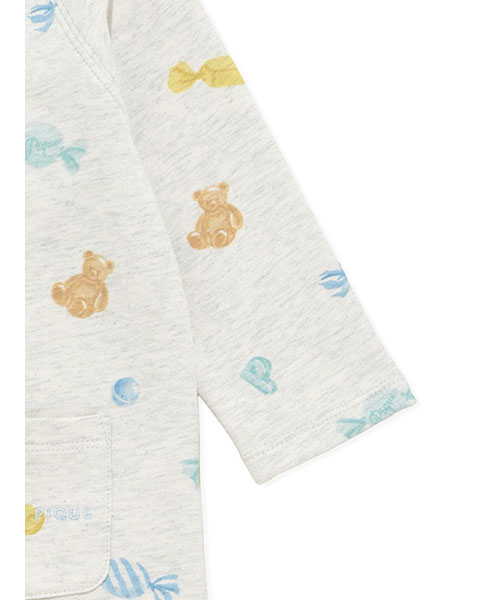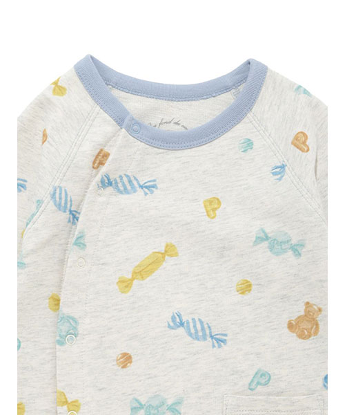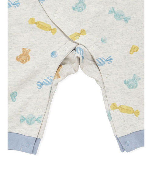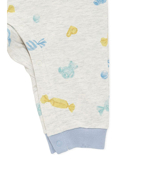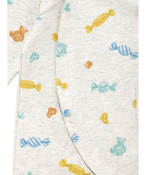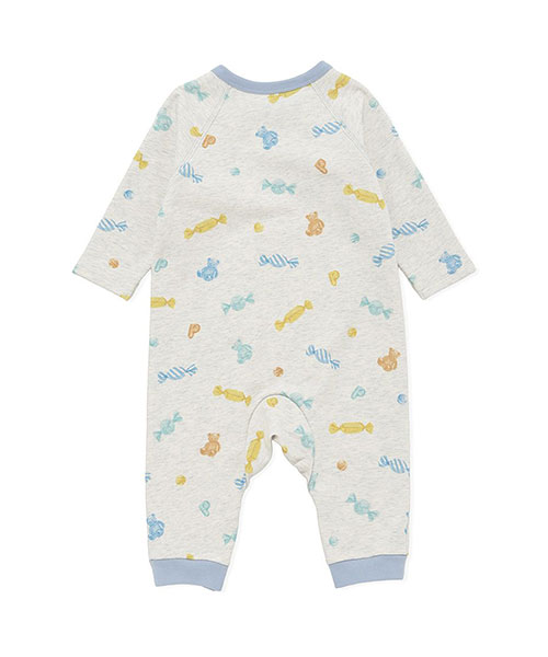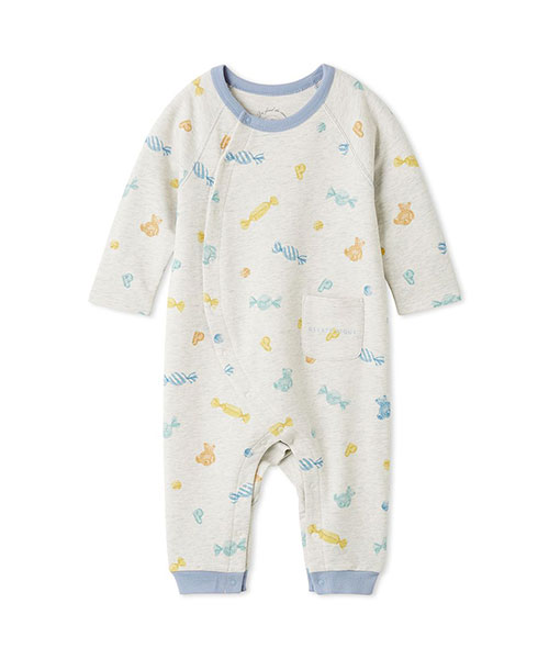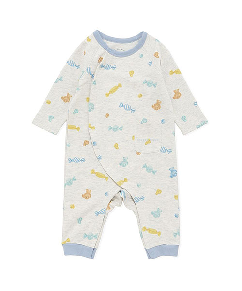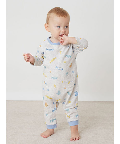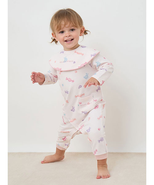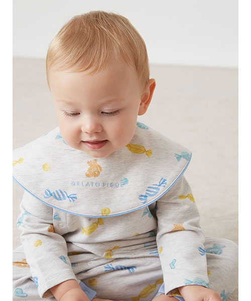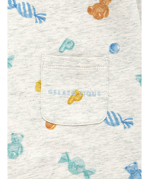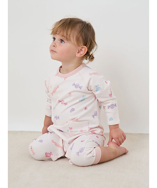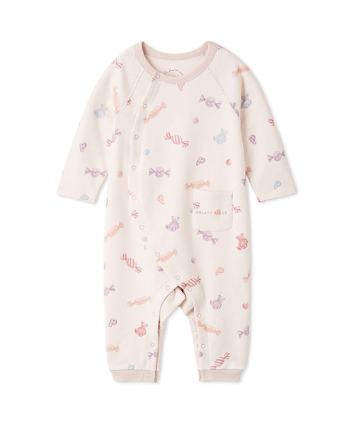 gelato piqueらしいベアやロゴモチーフのカラフルなキャンディを散りばめた、HAPPYな総柄プリントのBABYロンパースです。程良くふっくらとしたコットン混のインレイ素材を使用し、ゆったりとしたラグランスリーブで動きやすく仕上げました。首元と足首の配色デザインと、フロントポケットに入れた刺繍がポイントです。色はピンクと杢グレーの2色をご用意。LADIES’、KIDSとのリンク・コーディネートを楽しんだり、同シリーズのBABY小物と組み合わせてギフトにもおすすめのアイテムです。
