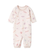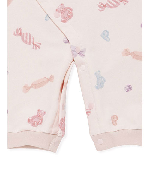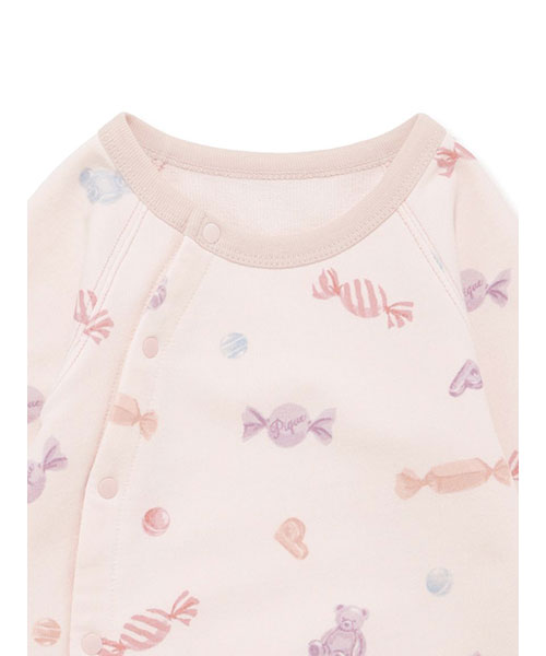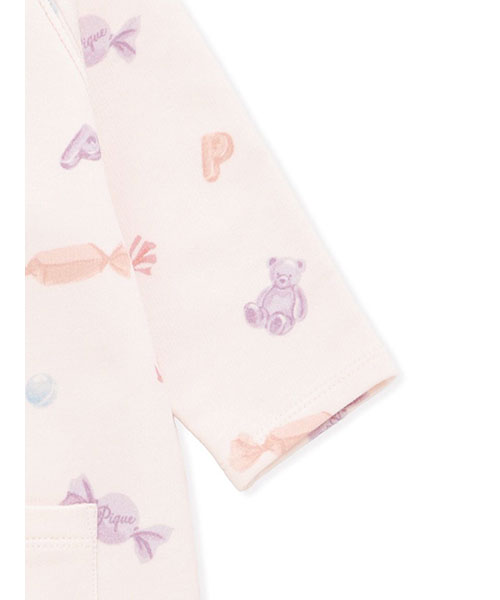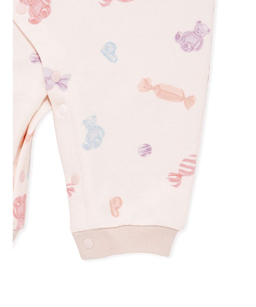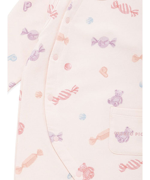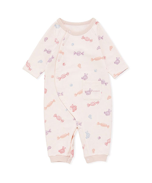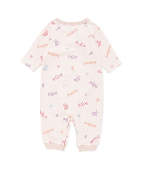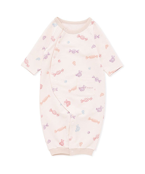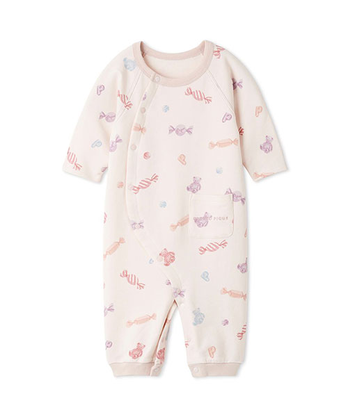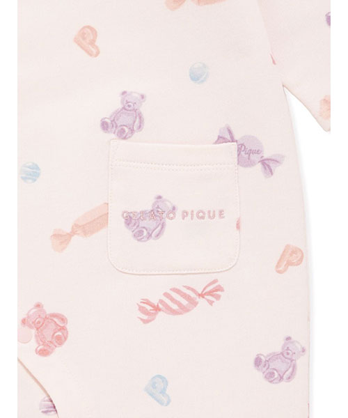 gelato piqueらしいベアやロゴモチーフのカラフルなキャンディを散りばめた、HAPPYな総柄プリントの2WAYオールです。程良くふっくらとしたコットン混のインレイ素材を使用し、ゆったりとしたラグランスリーブで動きやすく仕上げました。首元と足首の配色デザインと、フロントポケットに入れた刺繍がポイントです。色はピンクと杢グレーの2色をご用意。LADIES’、KIDSとのリンク・コーディネートを楽しんだり、同シリーズのBABY小物と組み合わせてギフトにもおすすめのアイテムです。