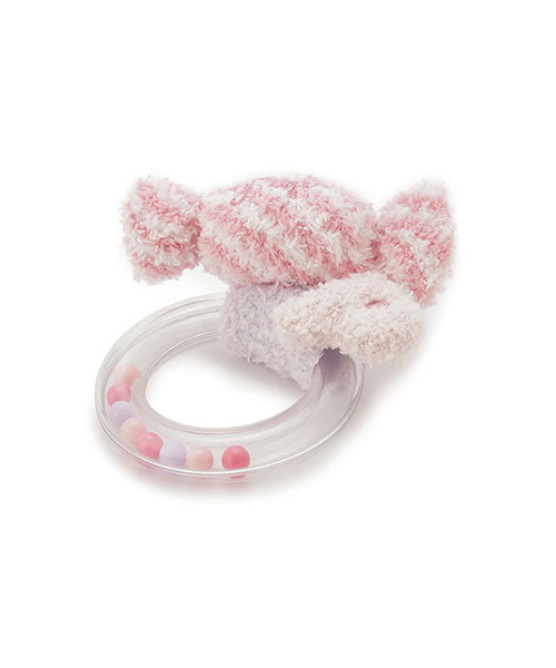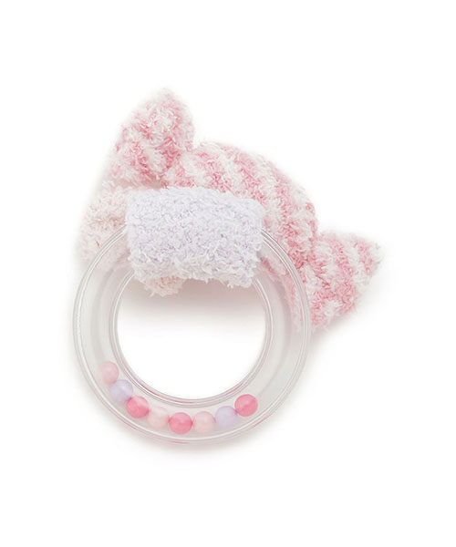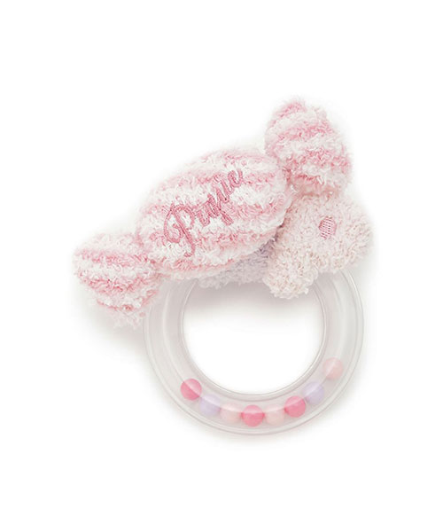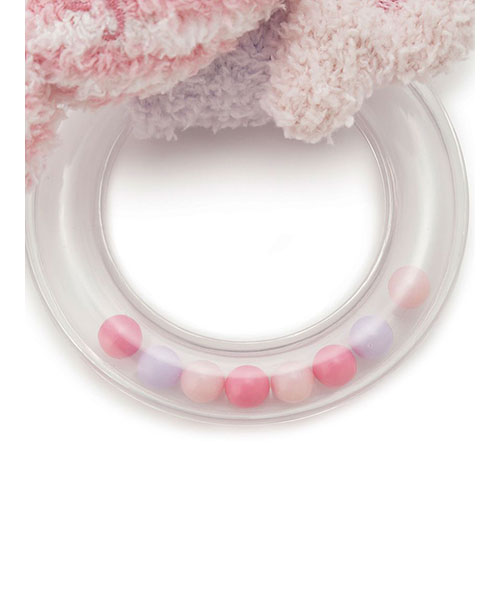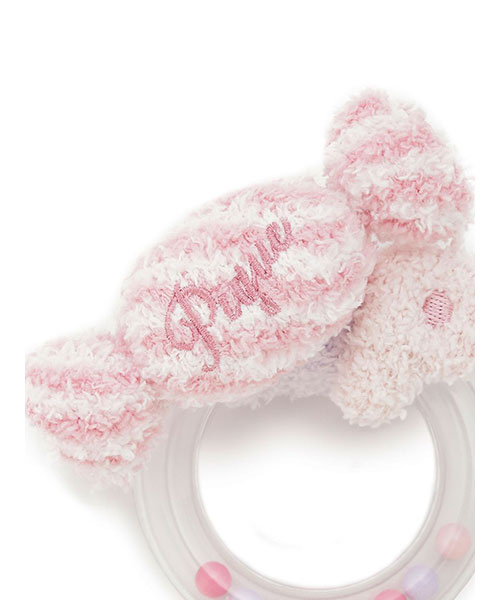 キュートなキャンディをモチーフにした、’ベビモコ’素材のBABYシリーズ。カラフルなビーズが入った透明の輪っかに、ふわふわのキャンディをあしらったBABYラトルです。ビーズの動きや、キャンディを握ったときの音や感触など、色々な仕掛けが赤ちゃんの関心を引き寄せます。同シリーズのルームウェアや小物に合わせたり、ギフトにもおすすめです。