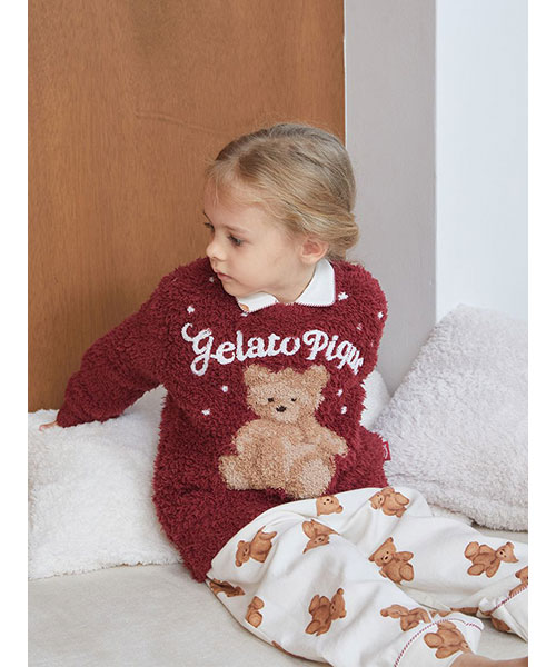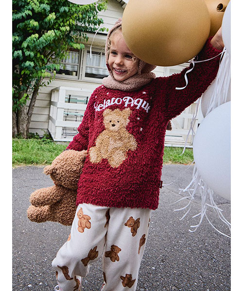 家族や友人、大切な誰かと過ごす温かなホリデーシーズンに寄り添う、ベアモチーフのルームウェアシリーズです。大きめのベアの総柄プリントが印象的な、温かみのあるネル素材のKIDSロングパンツ。ベーシックなストレートシルエットで仕上げました。裾や両脇のポケット口には、キャンディーケインをイメージしたボーダーのパイピング入り。右後ろのポケットには、gelato pique Holidayのロゴ刺繍もあしらっています。同シリーズのネルシャツや小物と合わせたり、LADIES’、HOMME、BABYサイズとのリンク・コーディネートもお楽しみいただけます。