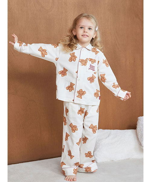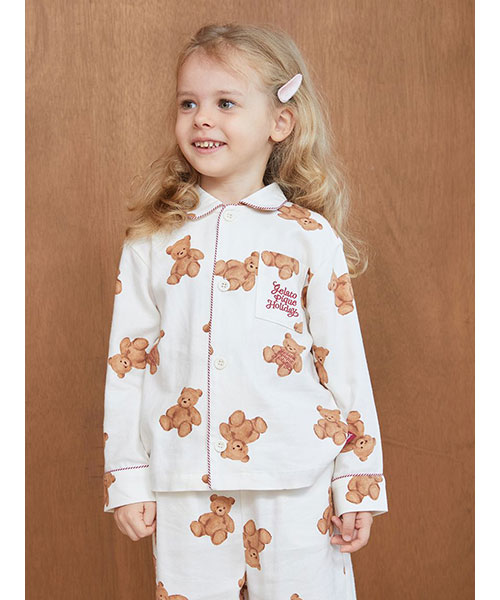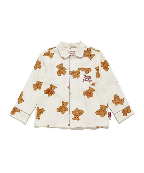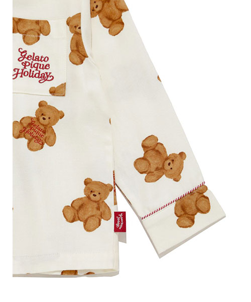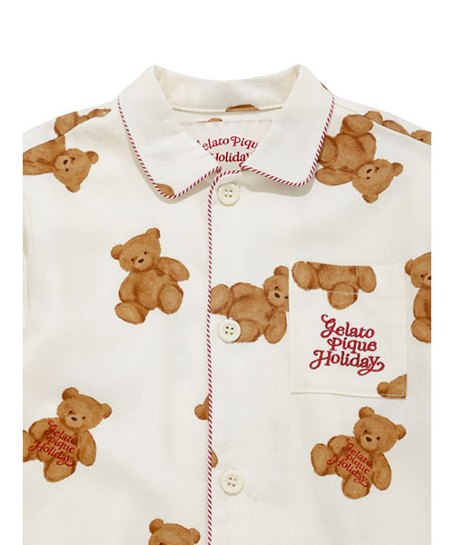 家族や友人、大切な誰かと過ごす温かなホリデーシーズンに寄り添う、ベアモチーフのルームウェアシリーズです。大きめのベアの総柄プリントが印象的な、温かみのあるネル素材のKIDSシャツ。襟元や袖口には、キャンディーケインをイメージしたボーダーのパイピングが入っています。gelato pique Holidayのロゴ刺繍が入った胸ポケット付き。同シリーズのネルロングパンツや小物と合わせたり、LADIES’、HOMME、BABYサイズとのリンク・コーディネートもお楽しみいただけます。
