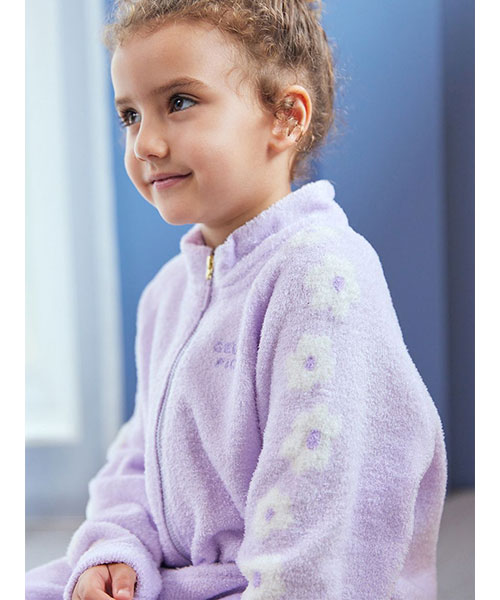 トレンドのスポーツテイストを旬のカラーリングで表現したシリーズ。袖にライン状のジャガード柄を入れた、キャッチーな存在感のトラックジャケットです。汗を素早く吸う吸水機能を備えているので、暑さが残りやすい秋の羽織りに最適な素材感。ジャガード柄は色ごとに異なる絵柄になっています。左胸のロゴ刺繍とファスナーの配色でアクセントを効かせました。色はベア柄のミント、フラワー柄のラベンダー、スター柄のブルーの3色展開。同シリーズのトラックパンツや同時期に展開するペイント柄カットソーシリーズを合わせたり、BABYアイテムとのリンクコーディネートもお楽しみいただけます。