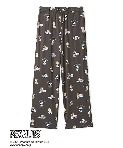 PEANUTSとgelato piqueのコラボレーションシリーズから、ファミリーでお楽しみいただける新作が登場。PEANUTSの仲間たちが、おやすみ前の幸せなひとときを過ごす様子をgelato piqueだけの特別なオリジナルアートに描き起こした、総柄プリントのメンズサイズロングパンツです。ゆったりとしてはきやすいストレートシルエット。枕で気持ちよさそうにしているスヌーピーや、アイスを食べているチャーリー・ブラウン、枕投げしているペパーミント パティなどの絵柄を散りばめました。色はベーシックな杢グレーとチャコールグレーの2色をご用意。同シリーズのラグランスリーブロンTと合わせたり、レディースサイズとのペアコーディネートもおすすめです。