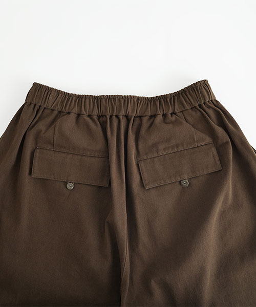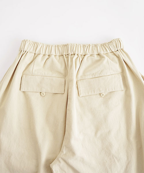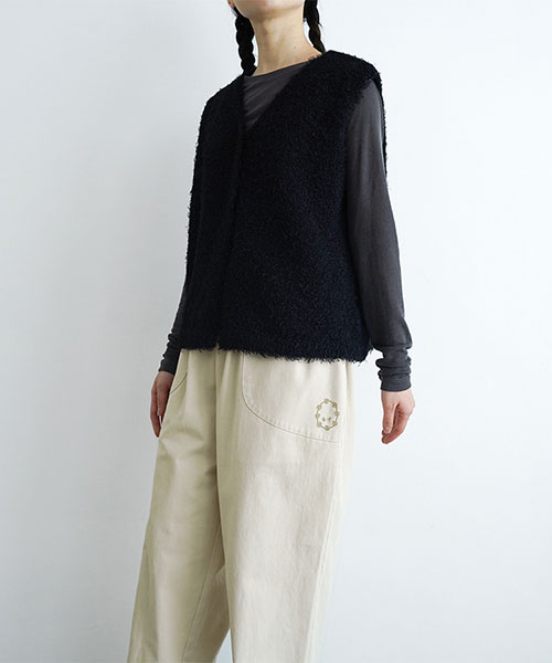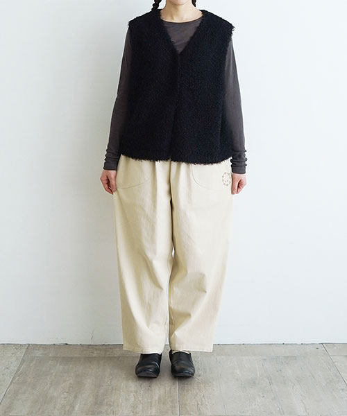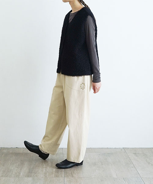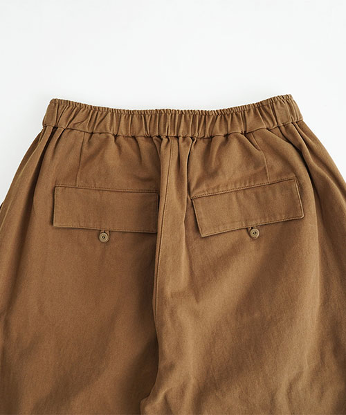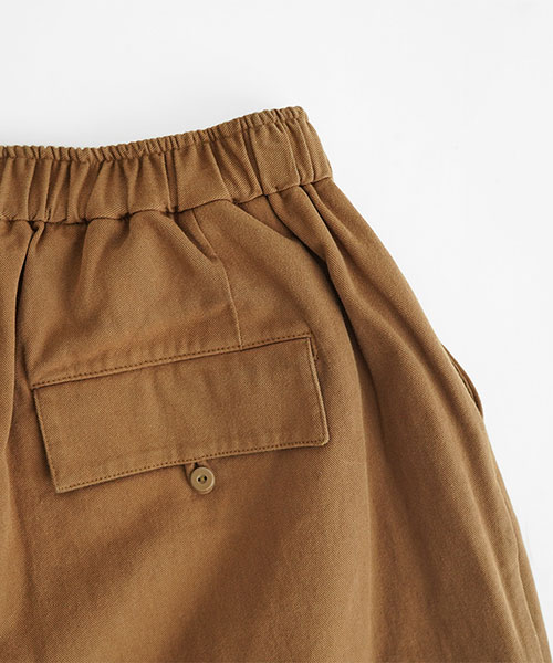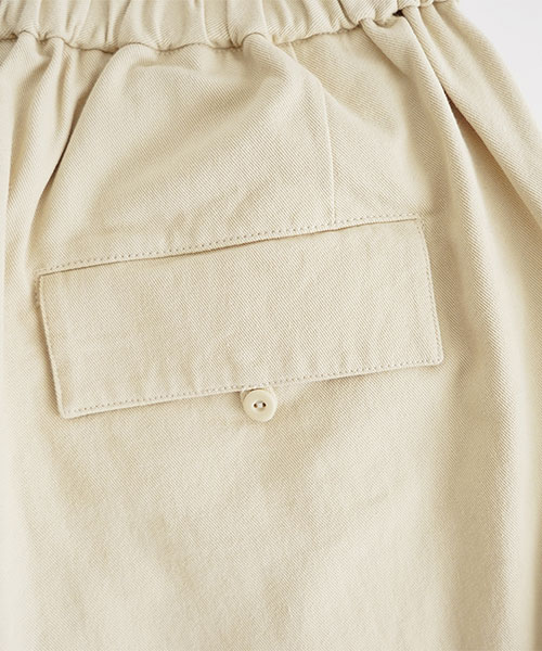 後ろ姿には蓋付きポケットをあしらい、ボタンはループでやさしく留められるデザイン。
