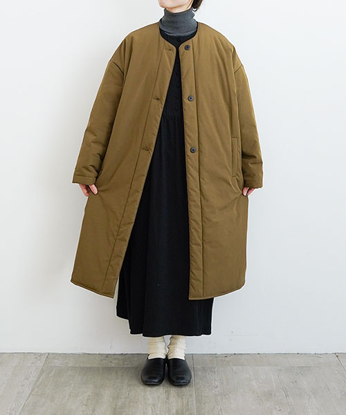 シンプルなノーカラーのデザインなので、タートルネックのトップスとも相性抜群。