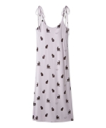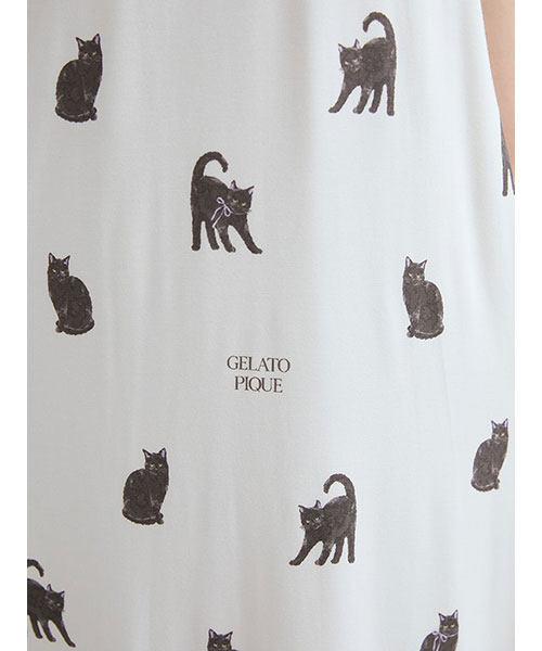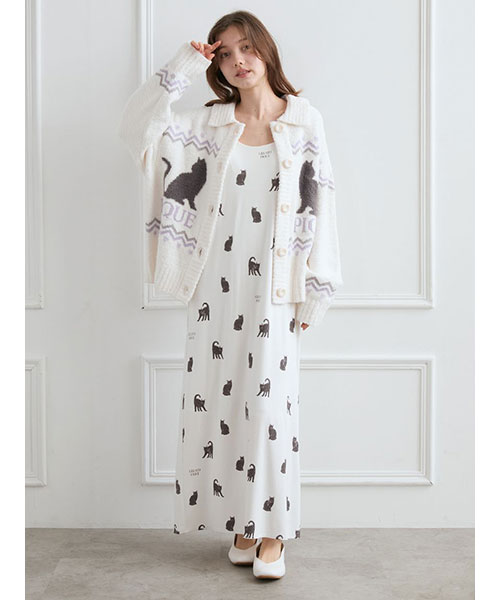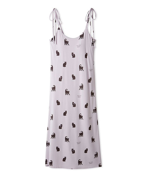 今年のHALLOWEEN COLLECTIONは、黒猫をテーマにした女子ライクなモノトーンスタイル。お座りポーズから、猫好きの方にはたまらない威嚇ポーズまで、表情豊かな黒猫を総柄プリントした裏地付きのカットソーキャミワンピースです。背面にややギャザーを入れた優しい着心地と、リボン結びのストラップがポイント。カップインなので一枚で着用が可能です。猫の耳にパープルをあしらったハロウィンらしいカラーリングです。背中側には小さくキラリとしたシルバーの刺繍ロゴを入れました。同シリーズのニットカーディガンや雑貨を組み合わせてお楽しみください。