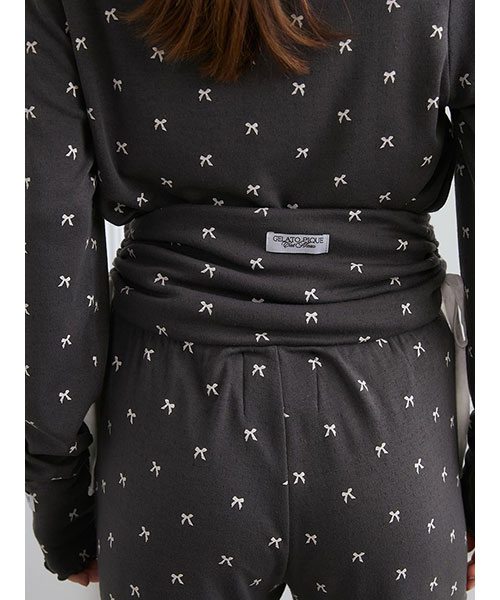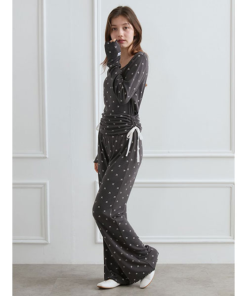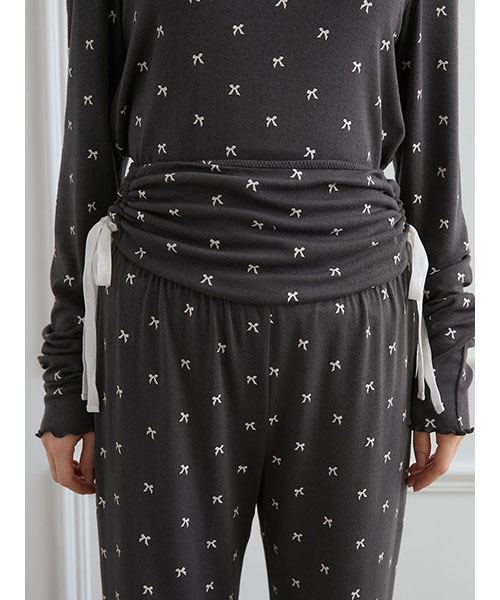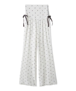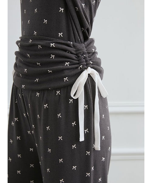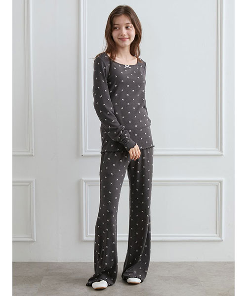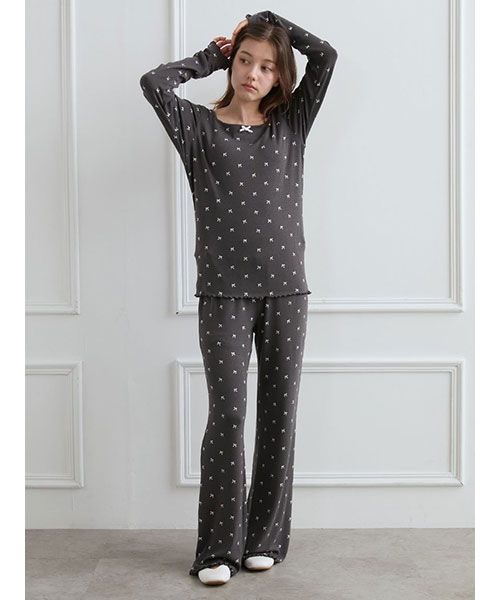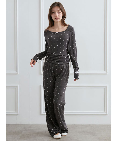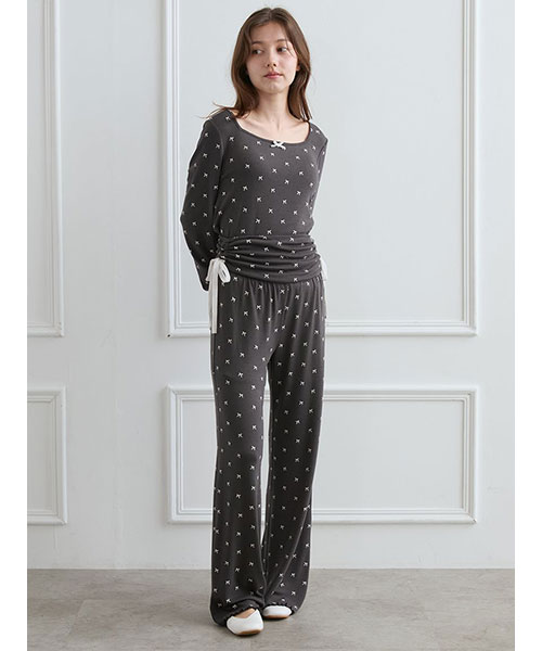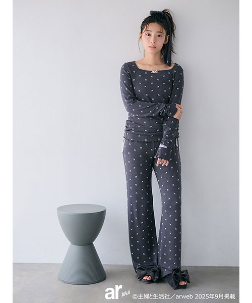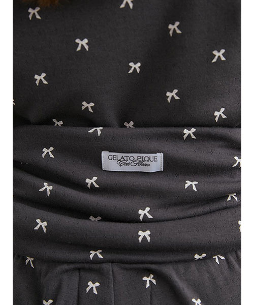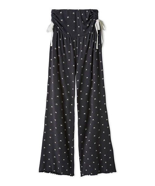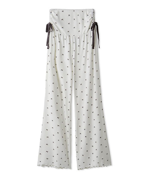 今年のHALLOWEEN COLLECTIONは、トレンドのリボン柄をフィーチャーした女子ライクなモノトーンスタイル。ソフトな風合いの針抜きカットソーに、ドット見えする小さなリボンプリントをあしらったロングパンツです。サイズ感はやや細身で、脚のラインをキレイに魅せてくれるフレアシルエット。ウエストはお腹周りをゆったりと包みつつ、ベロアリボンでくしゅっとシャーリングする可愛いデザインで仕上げました。背面のウエストにワンポイントで織りネームも添えました。長め丈のトップスや、ワンピース等のボトムとしても重宝します。同シリーズのトップスやニットカーディガンとのコーディネートがおすすめです。