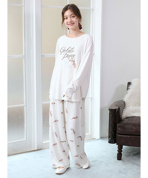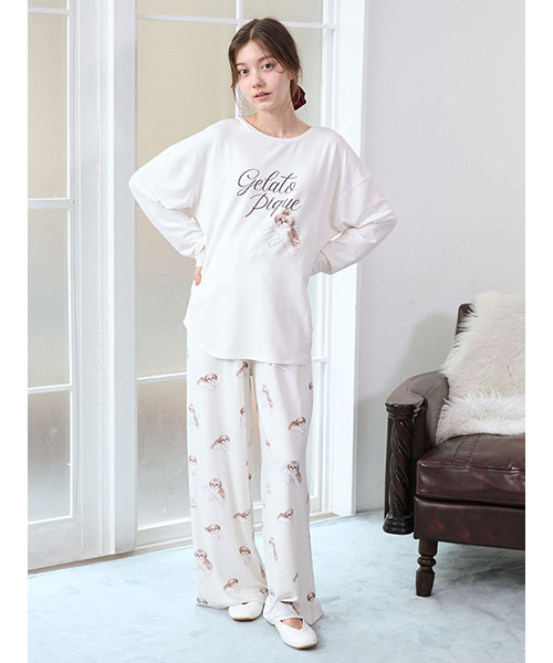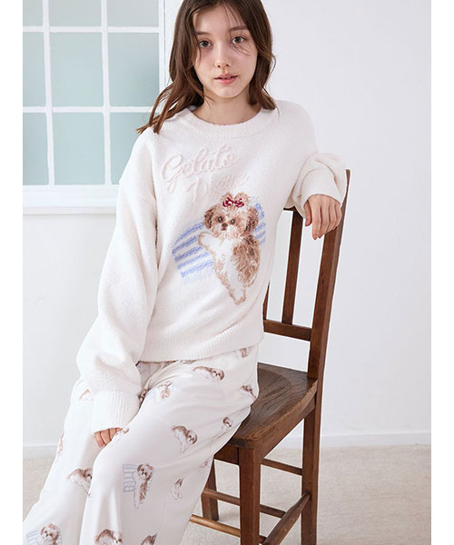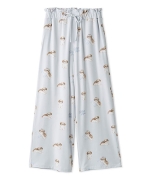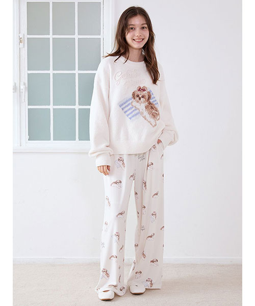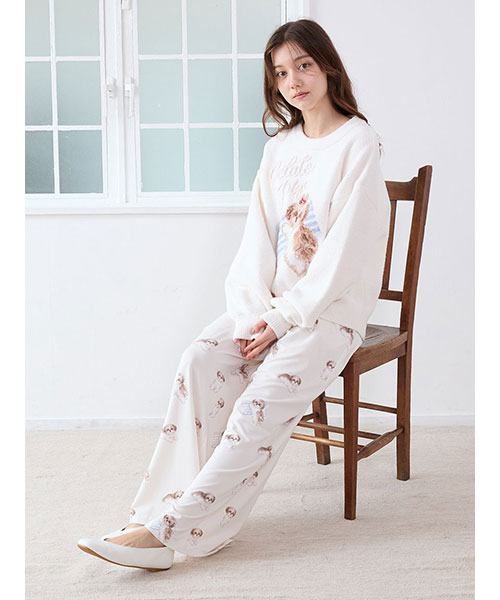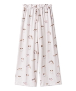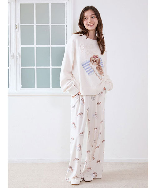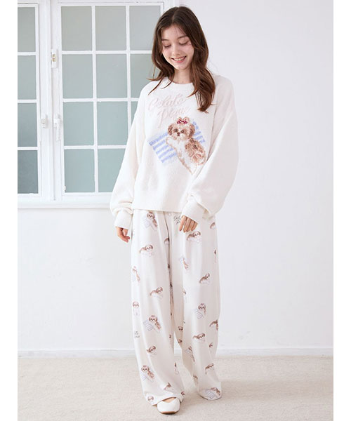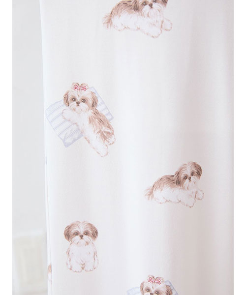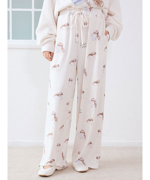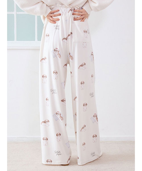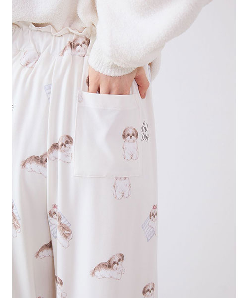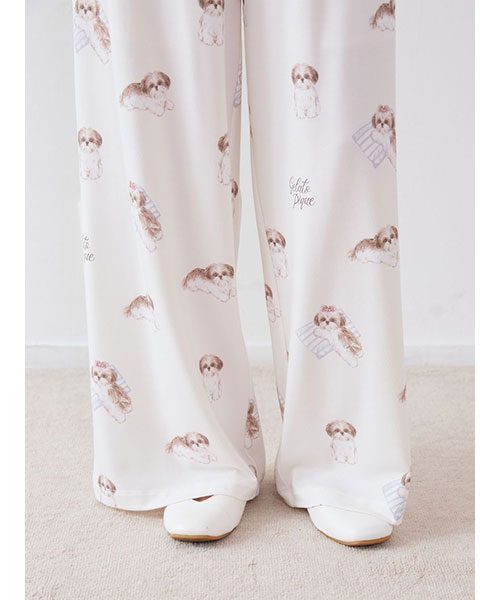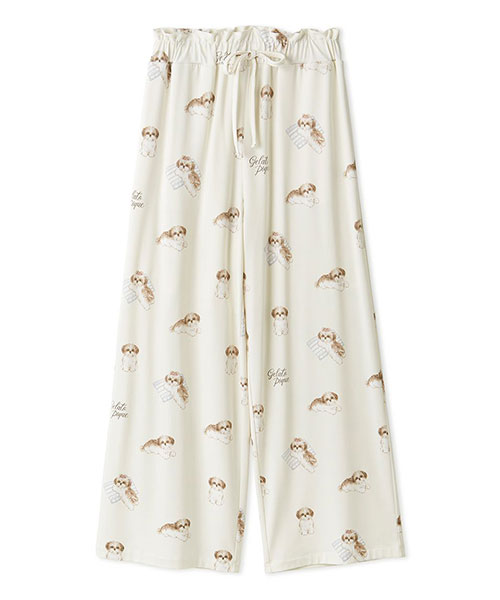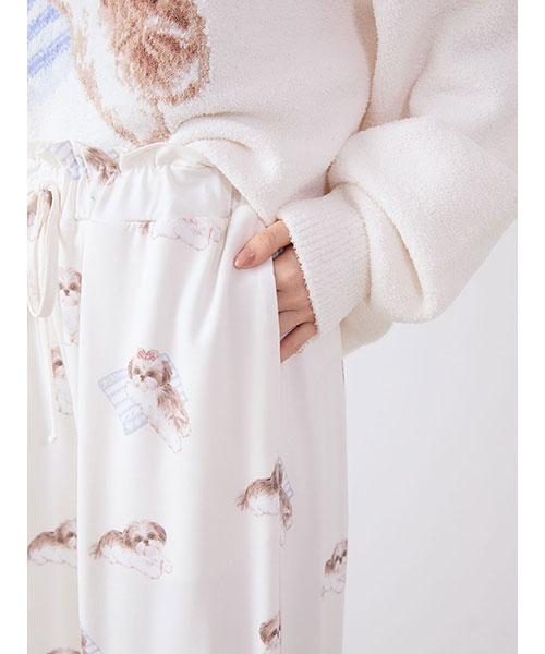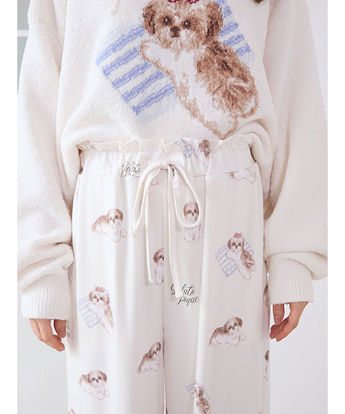 お気に入りの枕に寄り添う、リボンを付けたシーズー犬を描いたカットソーシリーズです。枕元でリラックスしたり、つぶらな瞳でこちらを見ていたり、色々な表情のシーズーを総柄プリントしたロングパンツ。タックインして着こなしやすいフリル付きのウエストで、両脇と右ヒップにはポケットが付いています。同シリーズのパンツや雑貨、同時期に展開するシーズーのニットプルオーバーと合わせてお楽しみください。