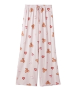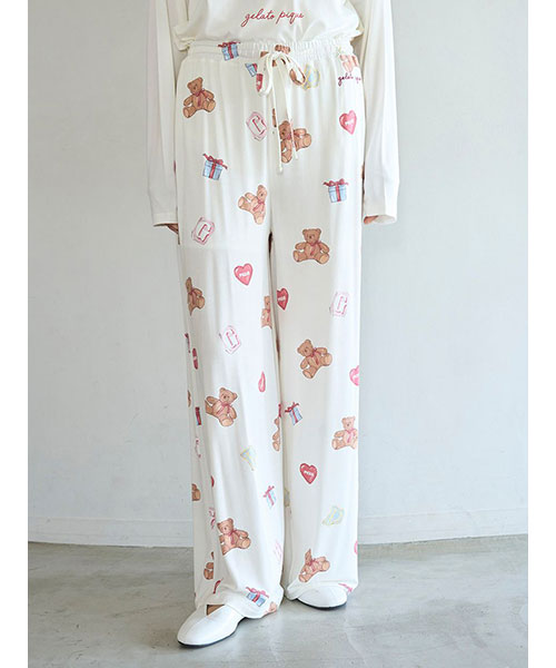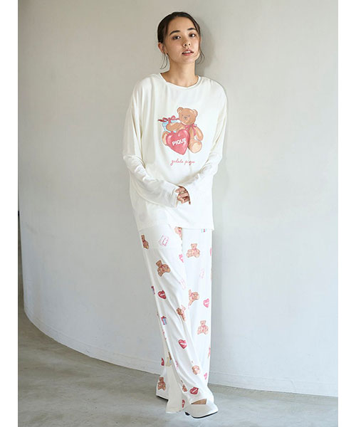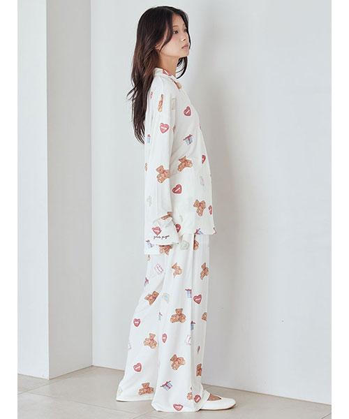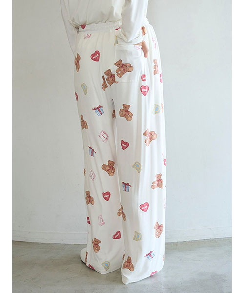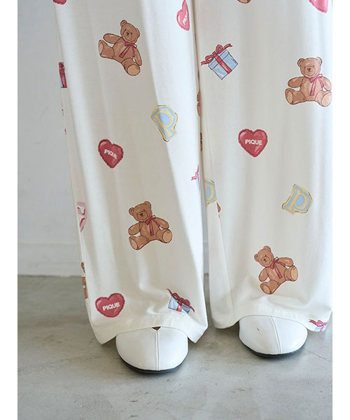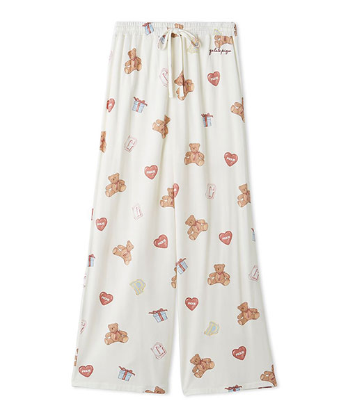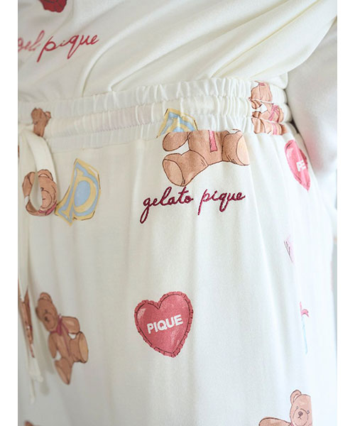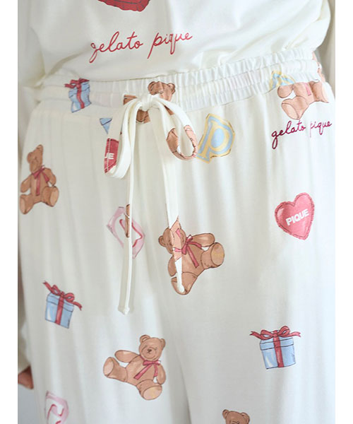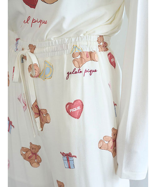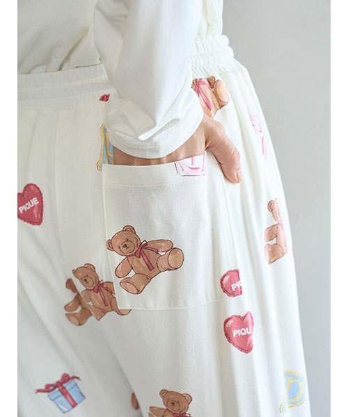 お気に入りのベアのぬいぐるみと暮らす、女の子のキュートなお部屋をイメージしたプリントカットソーのシリーズです。ベアのぬいぐるみとギフトボックス、ハートのクッション、雑誌から切り抜いた『P』と『G』を総柄プリントしたロングパンツ。いつでも楽に着用いただける、ゆったりとしたストレートシルエットで仕上げました。これからのホリデーシーズンにも似合うハートフルな柄と、ウエスト左脇に施した手書き風のロゴ刺繍がポイントです。色は優しいオフホワイトとピンクの2色展開。同シリーズのシャツに合わせたり、お揃いの柄を使用したベビモコ素材のベアさがらシリーズと合わせるのもおすすめです。