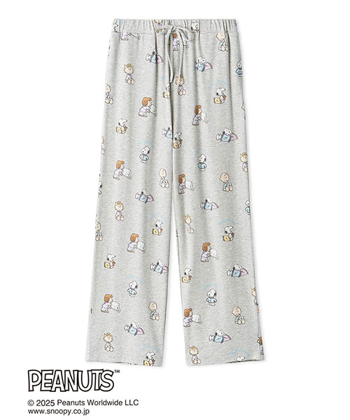 PEANUTSとgelato piqueのコラボレーションシリーズから、ファミリーでお楽しみいただける新作が登場。PEANUTSの仲間たちが、おやすみ前の幸せなひとときを過ごす様子をgelato piqueだけの特別なオリジナルアートに描き起こした、総柄プリントのゆったりとしたロングパンツです。枕で気持ちよさそうにしているスヌーピーや、アイスを食べているチャーリー・ブラウン、枕投げしているペパーミント パティなどの絵柄を散りばめました。色は優しい雰囲気のアイボリーと、杢グレーの2色をご用意。同シリーズの総柄ヘンリーネックのプルオーバーと合わせたり、メンズサイズとのペアコーディネートもおすすめです。