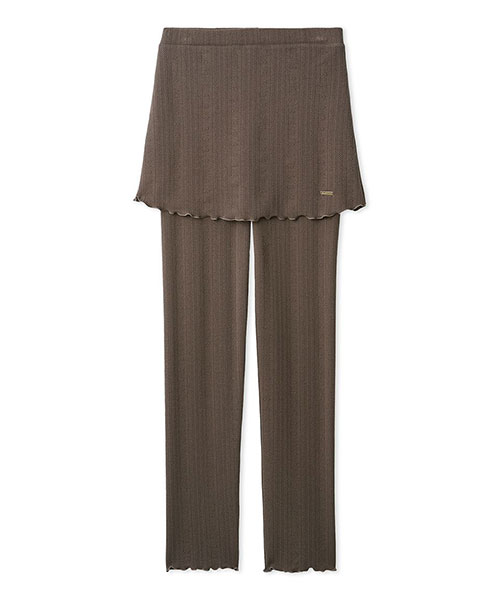 小さなハート柄のアラン模様を、ふくれジャガードで表現したカットソーシリーズ。ミニスカートがドッキングした、下着の透けが気にならないレギンスです。伸縮性に富むカットソーなので、動きやすさも抜群。シリーズ共通であしらったゴールドのプレートがさりげないアクセントになっています。色はクリームとブラウンの2色をご用意。同シリーズのプルオーバーに合わせたり、同時期に展開するハート柄ニットシリーズとのコーディネートもおすすめです。