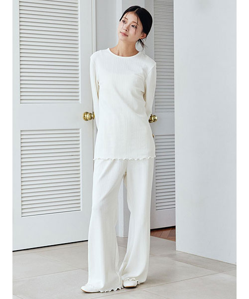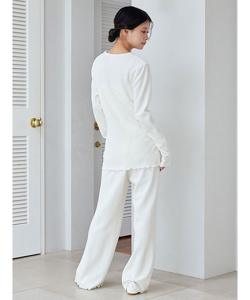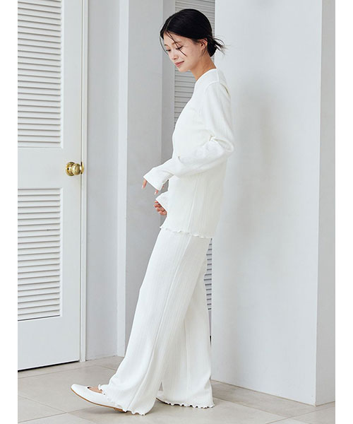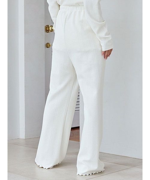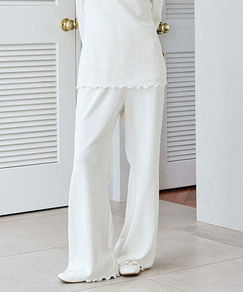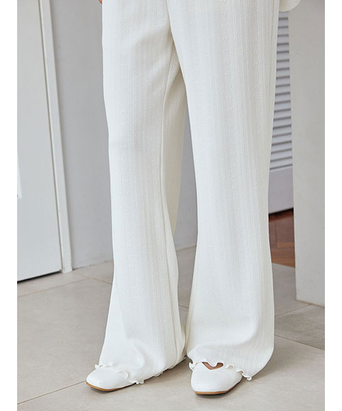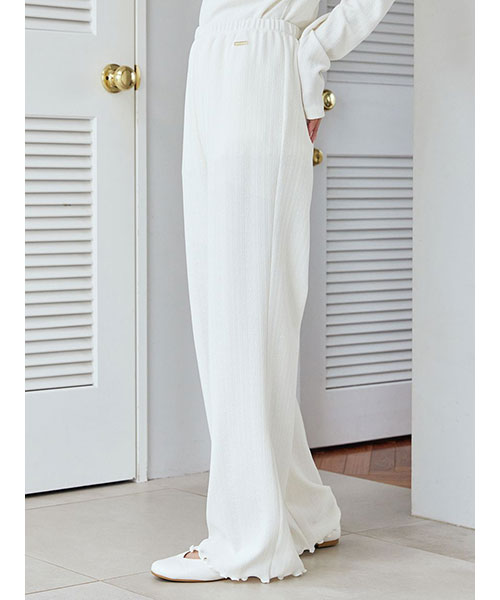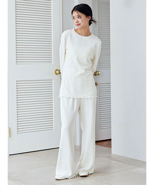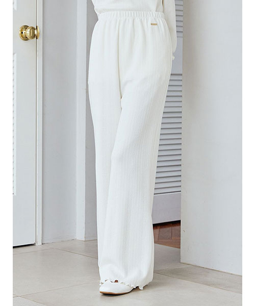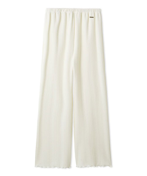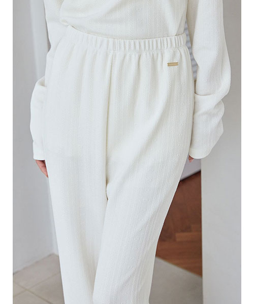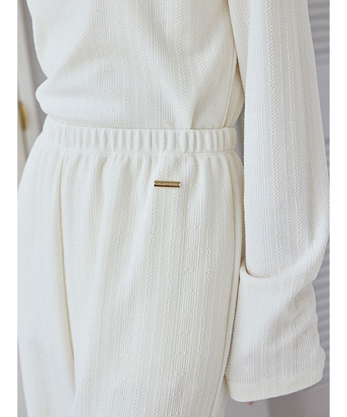 小さなハート柄のアラン模様を、ふくれジャガードで表現したカットソーシリーズ。ゆとりのあるストレートシルエットでリラックス感を出した、シンプルなロングパンツです。伸縮性に富むカットソーなので、動きやすさも抜群。シリーズ共通であしらったゴールドのプレートがさりげないアクセントになっています。色はクリームとブラウンの2色をご用意。同シリーズのプルオーバーに合わせたり、同時期に展開するハート柄ニットシリーズとのコーディネートもおすすめです。