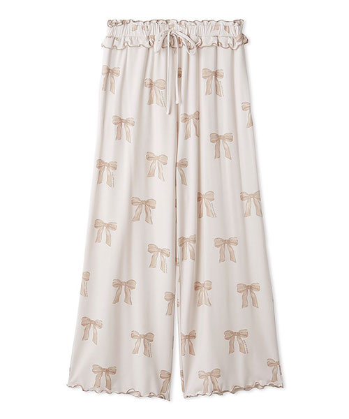 季節感のあるこっくりとしたタッチで描いたリボンを、総柄プリントしたカットソーシリーズです。なめらかなレーヨンを使用したとろみ感のあるロングパンツ。上下にフリルを付けたウエストと、裾にメローステッチを施してフェミニンなニュアンスを加えました。両脇にポケット付きでデイリーにはける1枚です。色はベージュとピンク、ブルーの3色をご用意。同シリーズのロンTやキャミソールに合わせたり、同時期に展開するリボンボタン付きのジェラートカーディガンと合わせるのもおすすめです。