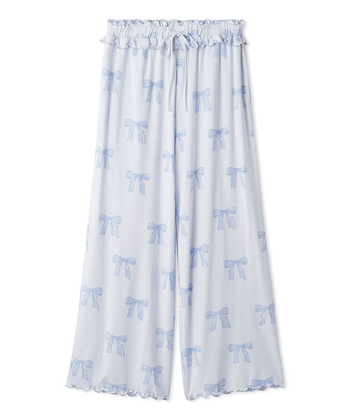 季節感のあるこっくりとしたタッチで描いたリボンを、総柄プリントしたカットソーシリーズです。なめらかなレーヨンを使用したとろみ感のあるロングパンツ。上下にフリルを付けたウエストと、裾にメローステッチを施してフェミニンなニュアンスを加えました。両脇にポケット付きでデイリーにはける1枚です。色はベージュとピンク、ブルーの3色をご用意。同シリーズのロンTやキャミソールに合わせたり、同時期に展開するリボンボタン付きのジェラートカーディガンと合わせるのもおすすめです。
