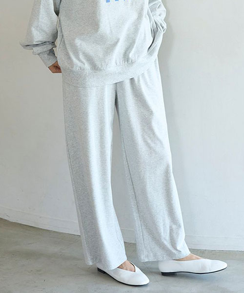 伸縮性のある綿素材を使用したルームウェアシリーズです。脚長効果を意識した、すとんと落ちるゆったりシルエットのロングパンツ。両脇にポケット付きで、ガーリーなカレッジテイストをお楽しみいただけます。色はキュートな小花柄プリントのピンクと、合わせやすい無地のアイボリー、カジュアルに楽しめる杢グレーの3色をご用意しました。同シリーズのロングTシャツに合わせたり、同時期に展開するジェラートボーダーシリーズとのコーディネートもおすすめです。