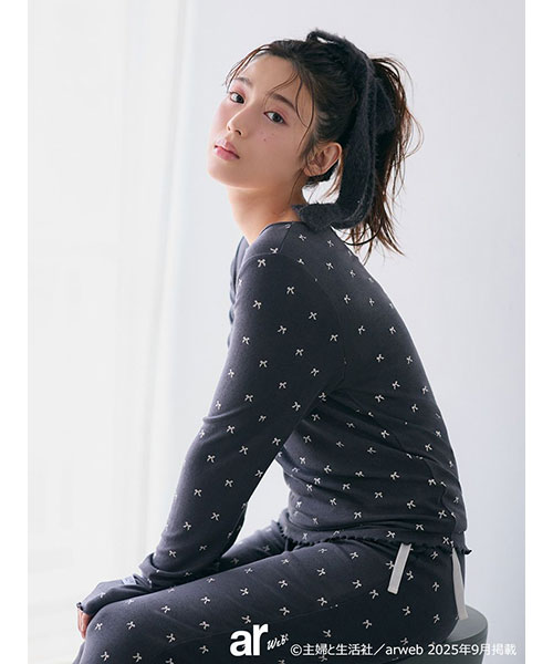 今年のHALLOWEEN COLLECTIONは、トレンドのリボン柄をフィーチャーした女子ライクなモノトーンスタイル。ソフトな風合いの針抜きカットソーに、ドット見えする小さなリボンプリントをあしらったプルオーバーです。メローの裾と袖口、上品なスクエア調の胸元に添えた小さなベロアリボンがアクセント。1枚でも、ワンピース等のインナーにも着用いただけるデザインです。同シリーズのニットカーディガンやロングパンツとのコーディネートがおすすめです。